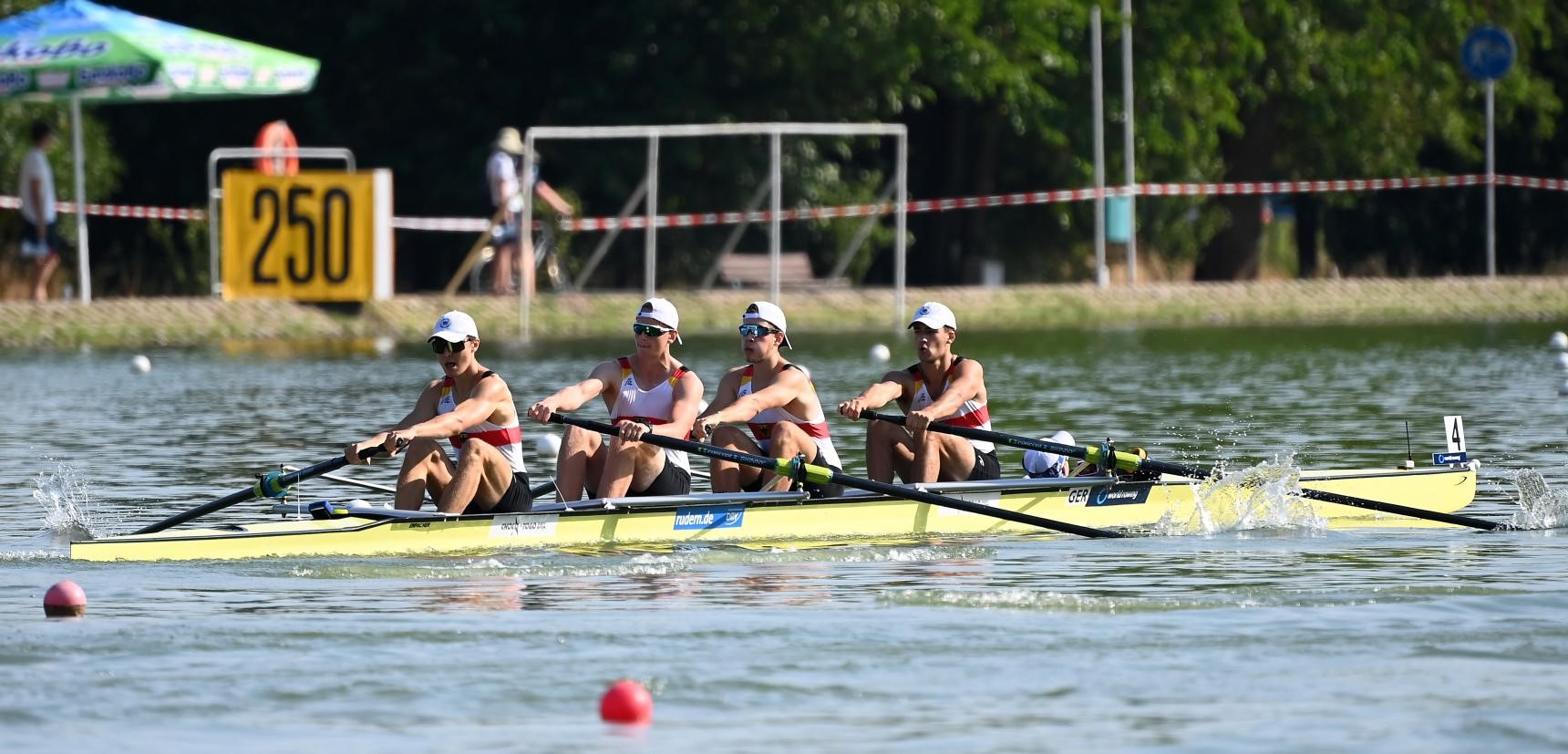 Im Frauen Doppelvierer liegen Marlene Schollmeyer (RU Arkona) und Lina Götze (RK am Wannsee) bei 1500 m noch gleichauf mit den Rumäninnen auf Platz vier. Im Ziel werden sie mit der Bronze-Medaille belohnt. Das Boot wird trainiert von Louisa Neuland (RU Arkona).