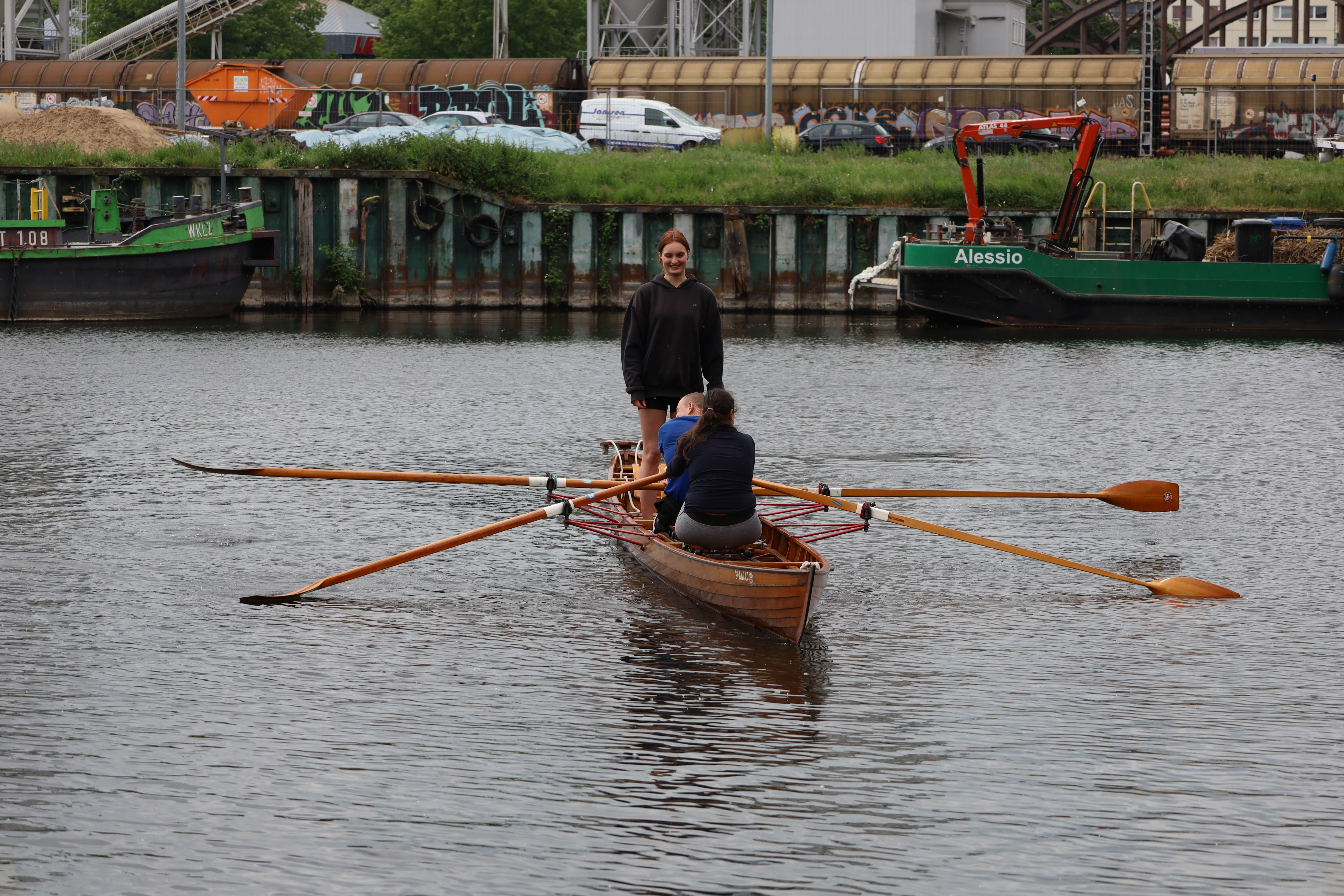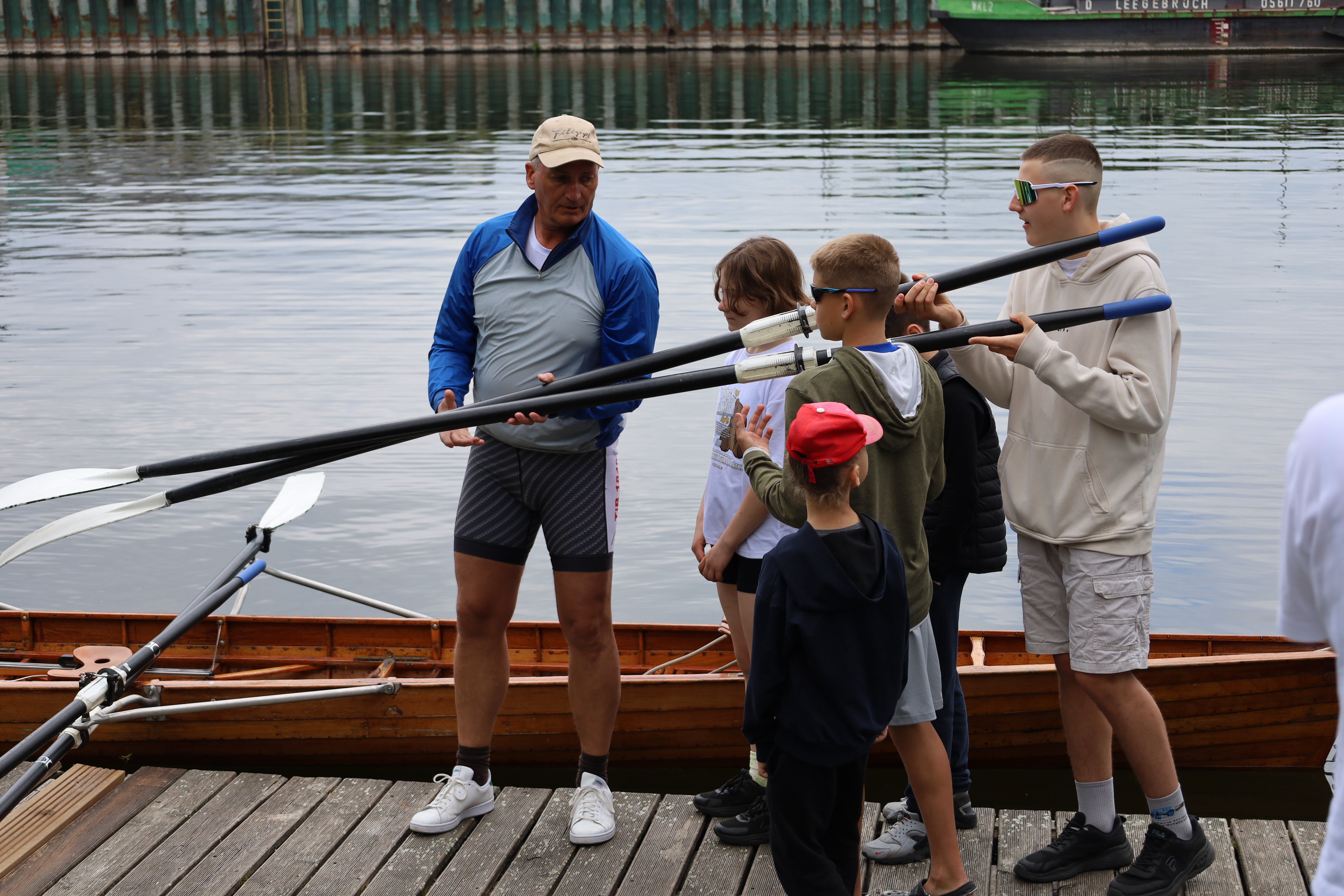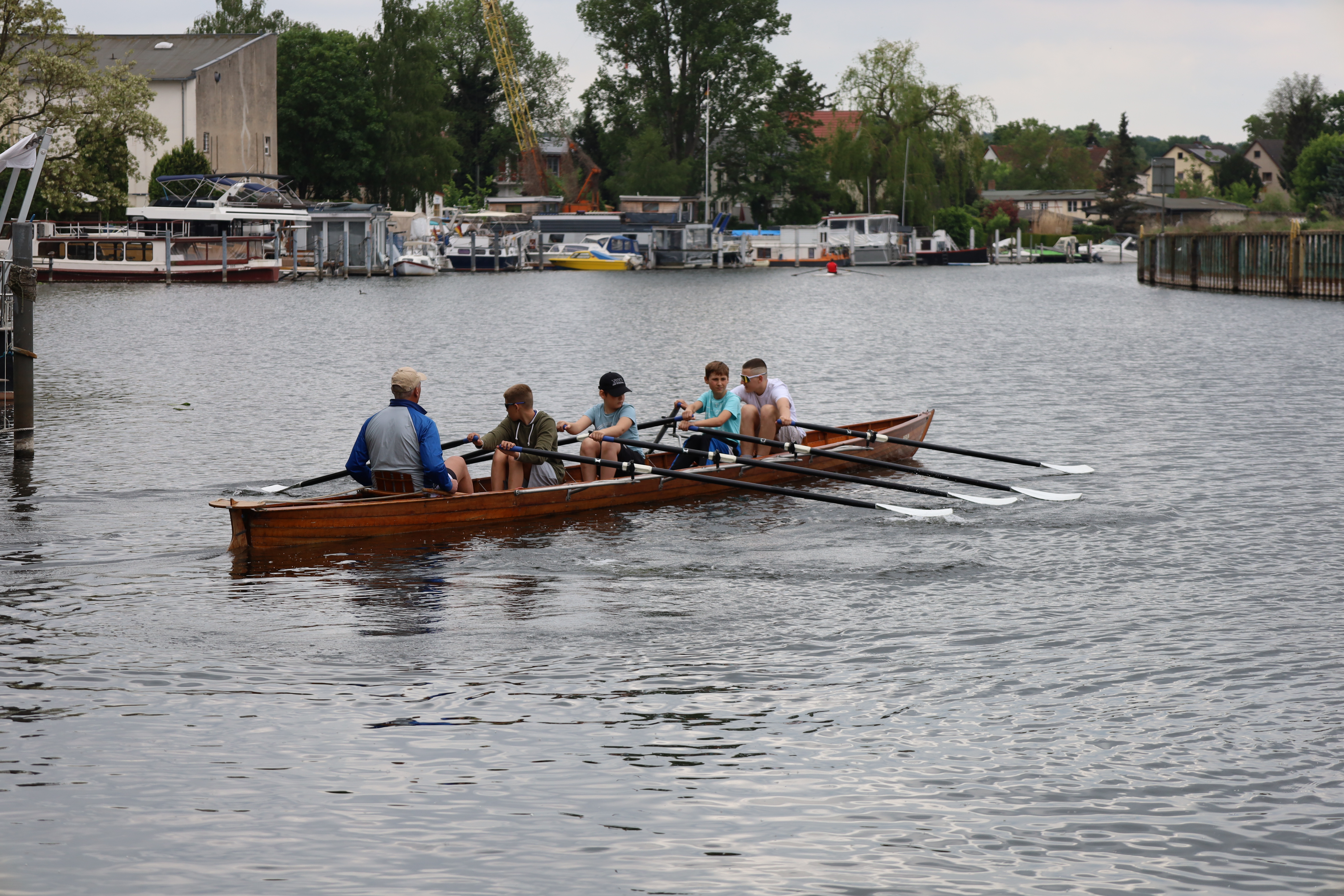 Bevor es aufs Wasser geht, erläutert Abteilungsleiter Thomas Gäbel, früher ein erfolgreicher Ruderer, die theoretischen Grundlagen und Sicherheitsanweisungen. Dann steigt er mit den jungen Anfängern ins Boot und steuert den Vierer über den Seitenarm der Havel. Nach rund einer halben Stunde sind die Nächsten dran.