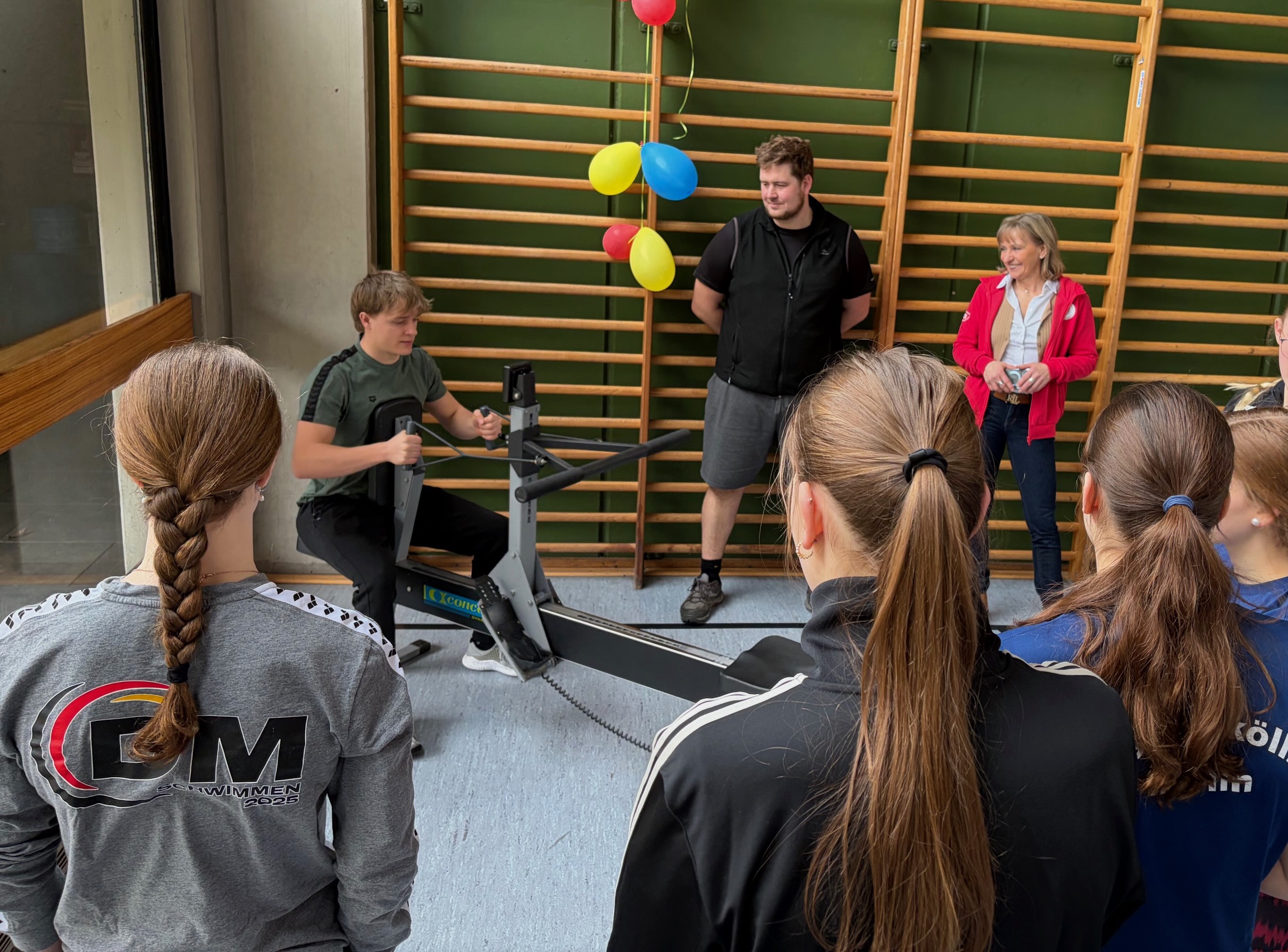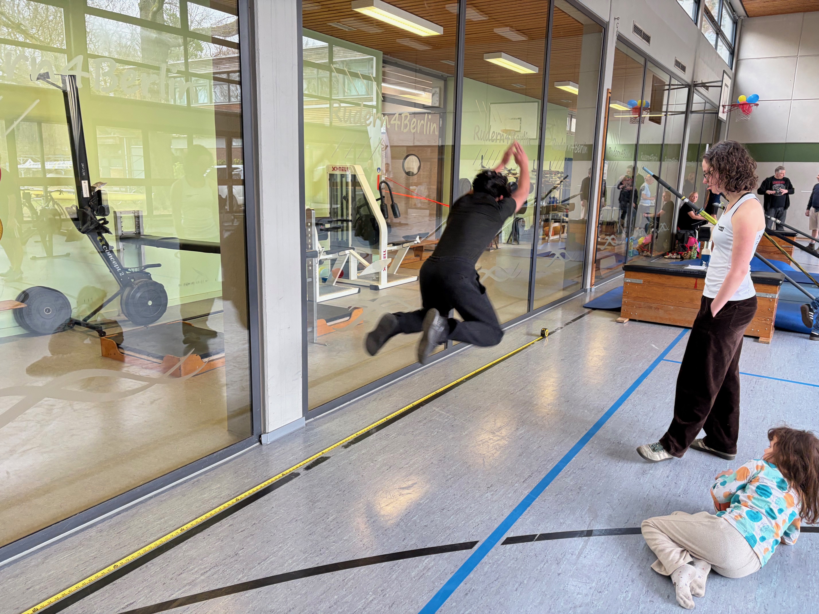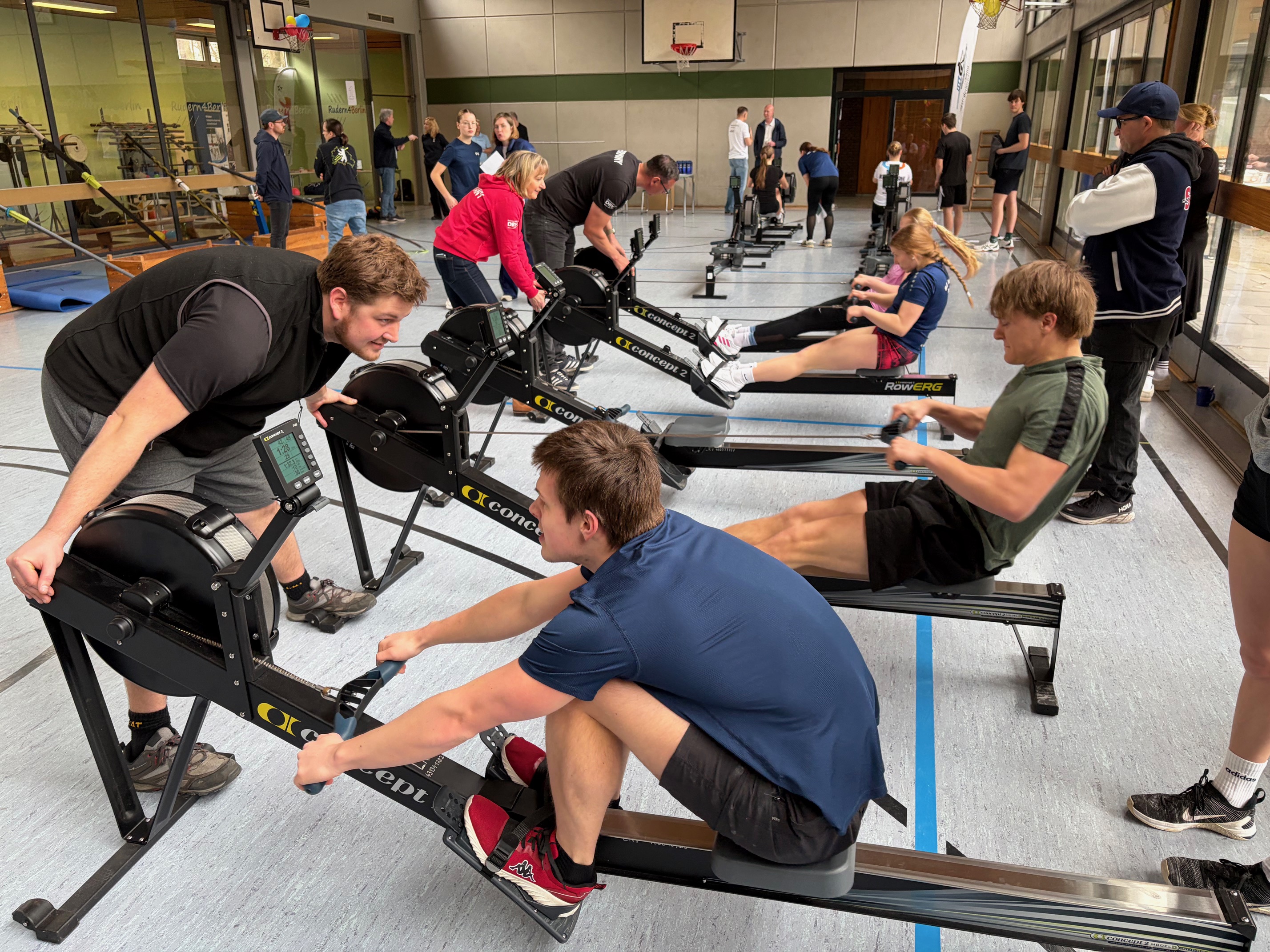 Die Trainer hatten in der großen Sporthalle verschiedene Stationen aufgebaut. Auf dem Concept 2 Dyno wurde mit Beinpresse und Armzug die Kraft gemessen. Beim Schluss-Dreisprung und im Standhochsprung ging es um die Leistungsfähigkeit der Bein- und Hüftstrecke. Auf den Ruderergometern konnten sich die Mädchen und Jungen schließlich richtig auspowern.