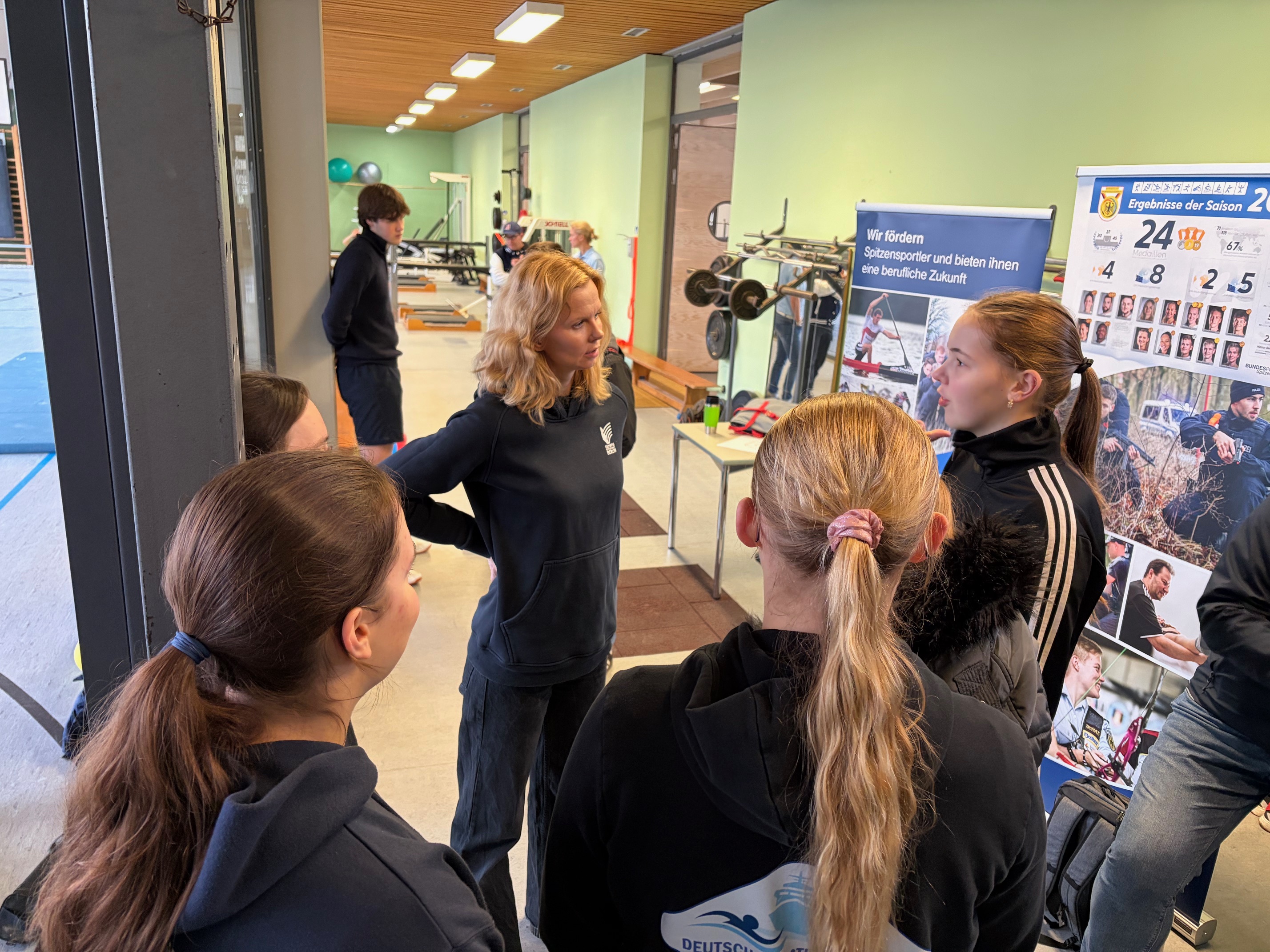 Wie Spitzensportlerinnen und -sportler bei ihrer beruflichen Ausbildung unterstützt werden, erläuterten vor Ort zwei ehemalige erfolgreiche Olympionikinnen: Britta Steffen, Doppel-Olympiasiegerin im Schwimmen 2008 und heute Laufbahnberaterin beim Olympiastützpunkt, und Britta Oppelt, Silbermedaillengewinnerin im Rudern bei den Olympischen Spielen 2004 und 2012 – sie arbeitet heute bei der Bundespolizei, die zu den großen Förderern des Spitzensports gehört.