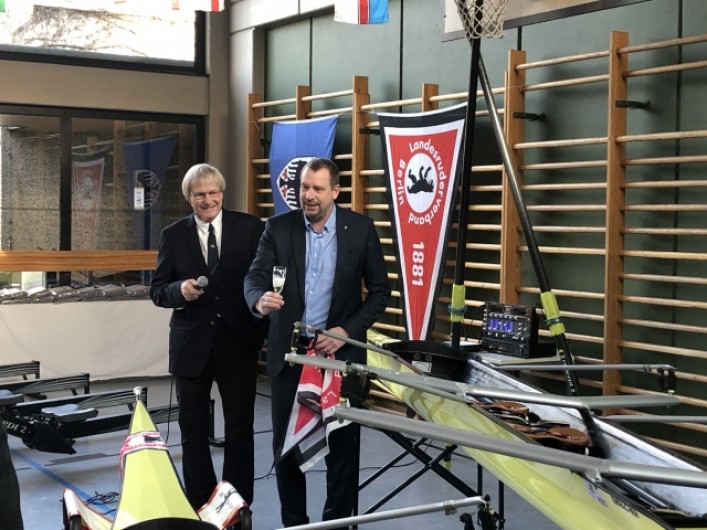 Der LRV Berlin pflegt die gute Tradition, erfolgreiche Aktive zu würdigen und ihren Trainern Dank zu sagen. Ein ganz besonders feierlicher Rahmen ist jedes Jahr der Flaggentag. Die große Sporthalle im Bundesstützpunkt am Hohenzollernkanal war auch am 12. Januar wieder festlich geschmückt: die Tische weiß gedeckt und die Flaggen der 60 Berliner Rudervereine aufgereiht. Wo sonst Spitzenathleten trainieren, wurde an die großen Siege von 2019 erinnert, u. a. an die WM-Goldmedaille von Martin Sauer mit dem Deutschland-Achter, die WM-Bronzemedaille von Ronja Fini Sturm im Leichtgewicht-Doppelvierer und die Bundesligasiege des Hauptstadtsprinters und des HavelQueen-Achters.