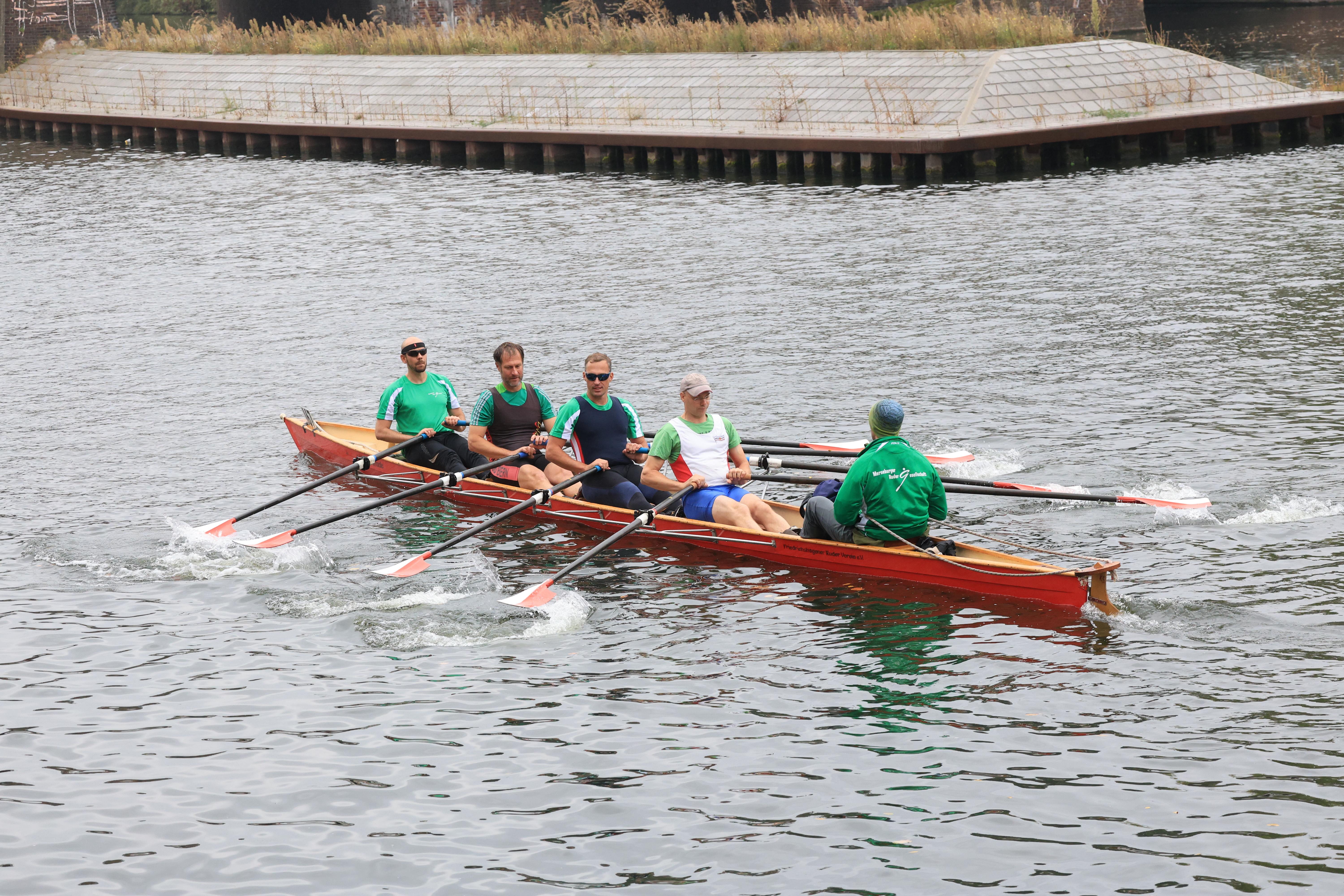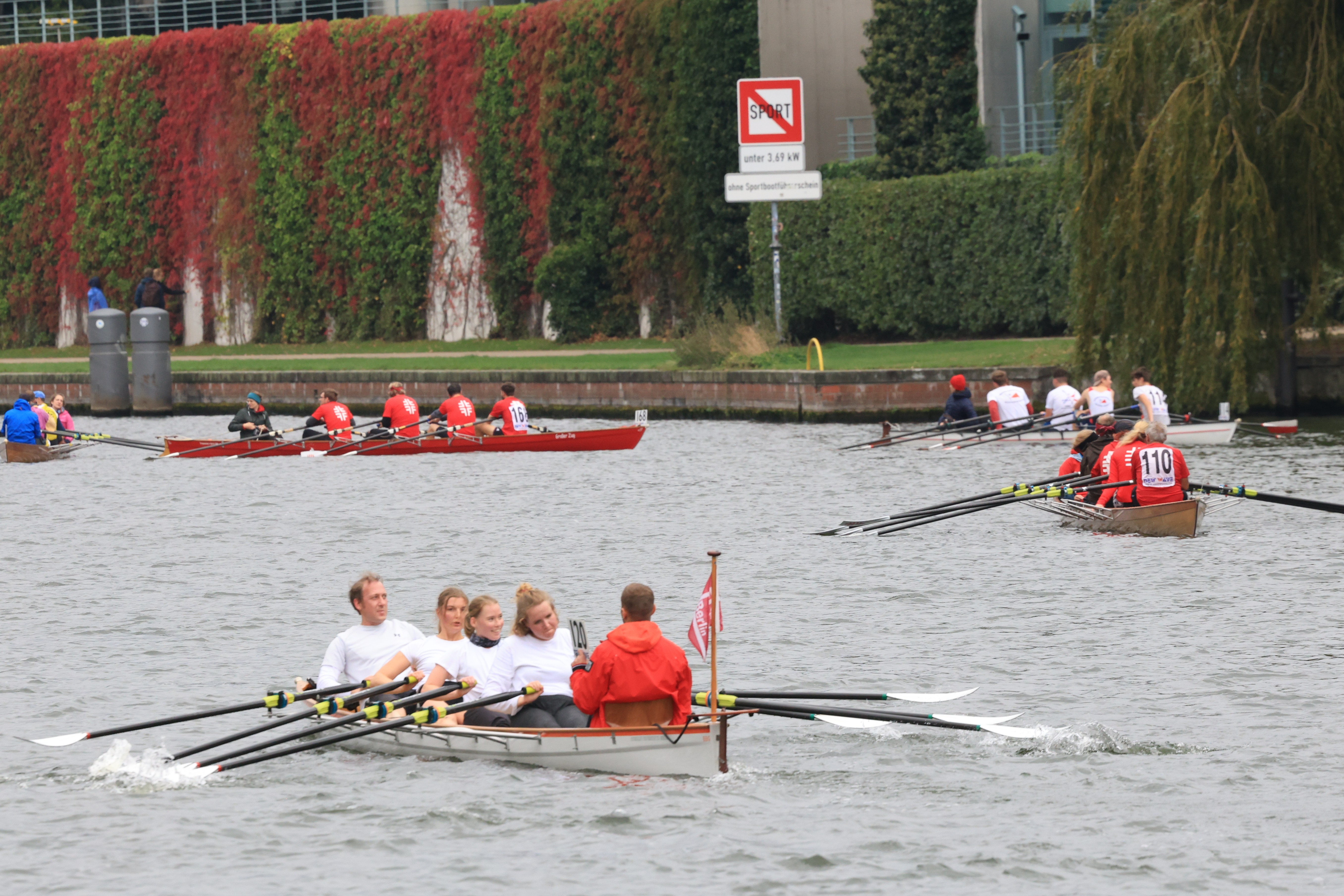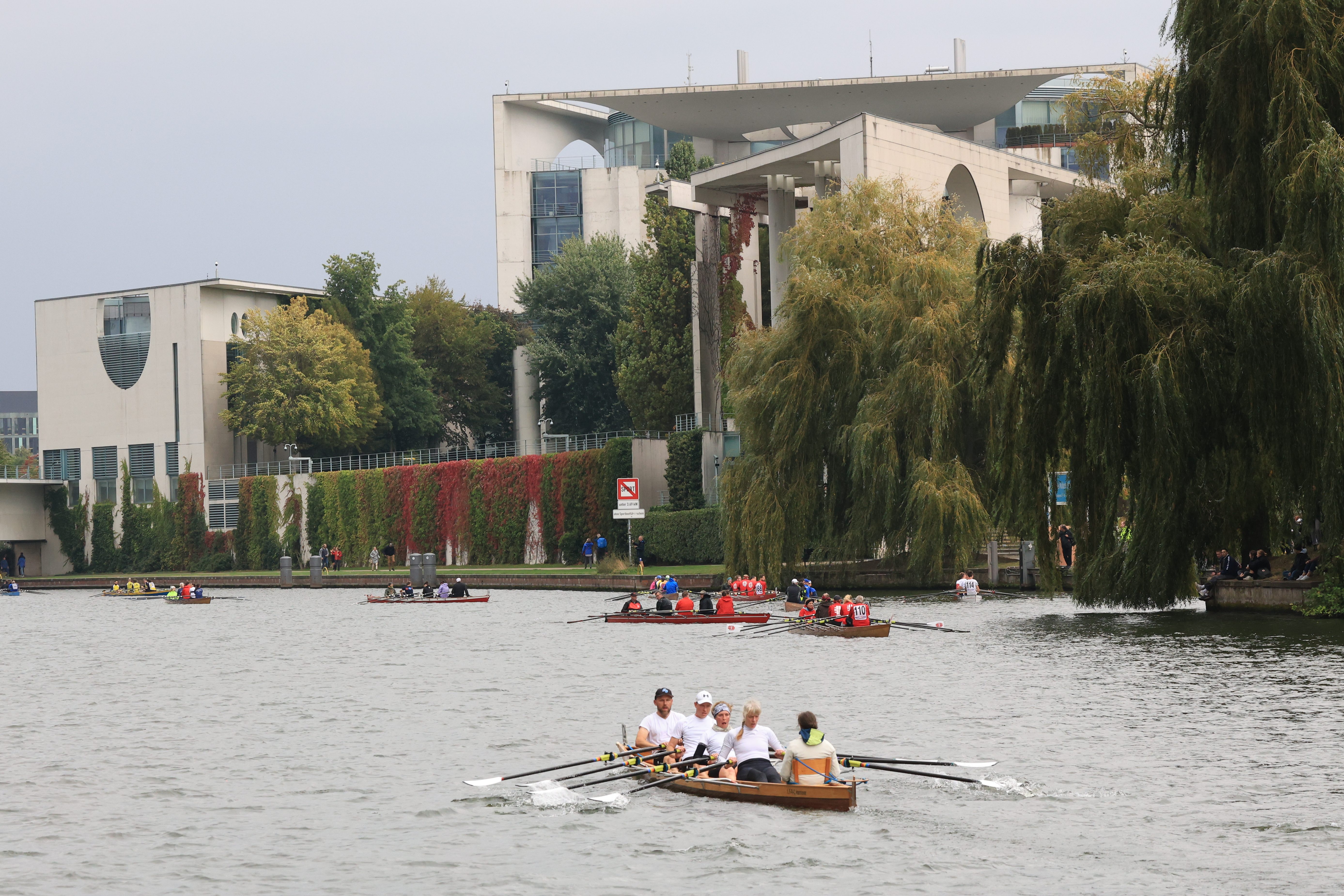 Los ging's im Minutentakt ab 13 Uhr an der Mörschbrücke. Die Route führte vorbei an berühmten Sehenswürdigkeiten. Schloss Charlottenburg, Siegessäule und Bundeskanzleramt als Kulisse für die schönste Stadtrundfahrt Berlins. Rudern auf der Innenstadtspree – das ist normalerweise verboten und lädt zum Genießen ein. Doch der Wettkampfgedanke spornt an. Je nach Altersklasse ging's über 3.000 bzw. 7.000 Meter bis zum Ziel vorm Haus der Kulturen der Welt. Dort signalisierte LRV-Präsidiumsmitglied für Pararudern, Matthias Wodtke, mit der Glocke in der Hand jeden Zieleinlauf. Die Sir Gusche Jazzband sorgte – wie jedes Jahr – für Partylaune und hatte für die ankommenden Boote immer einen Tusch parat.
