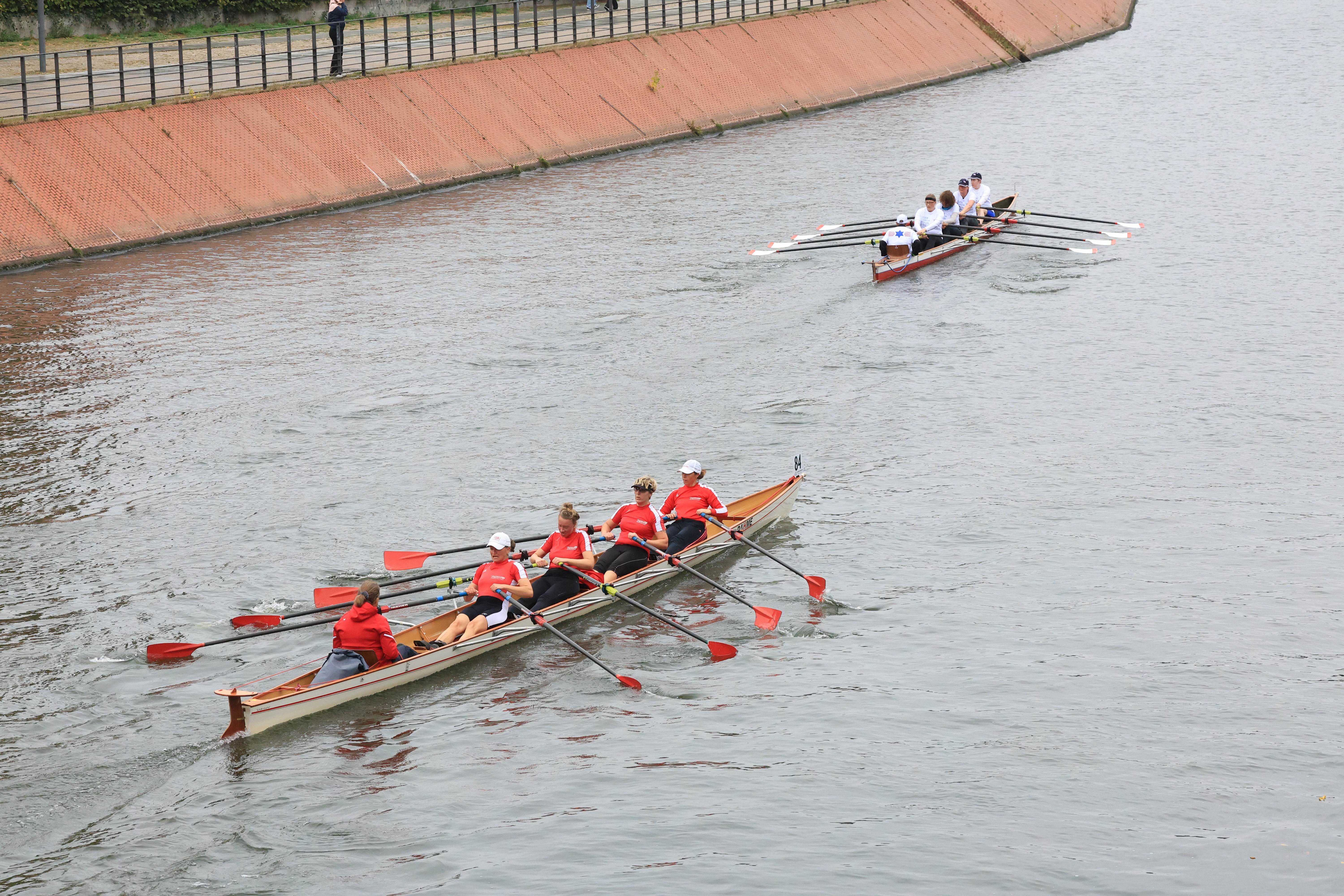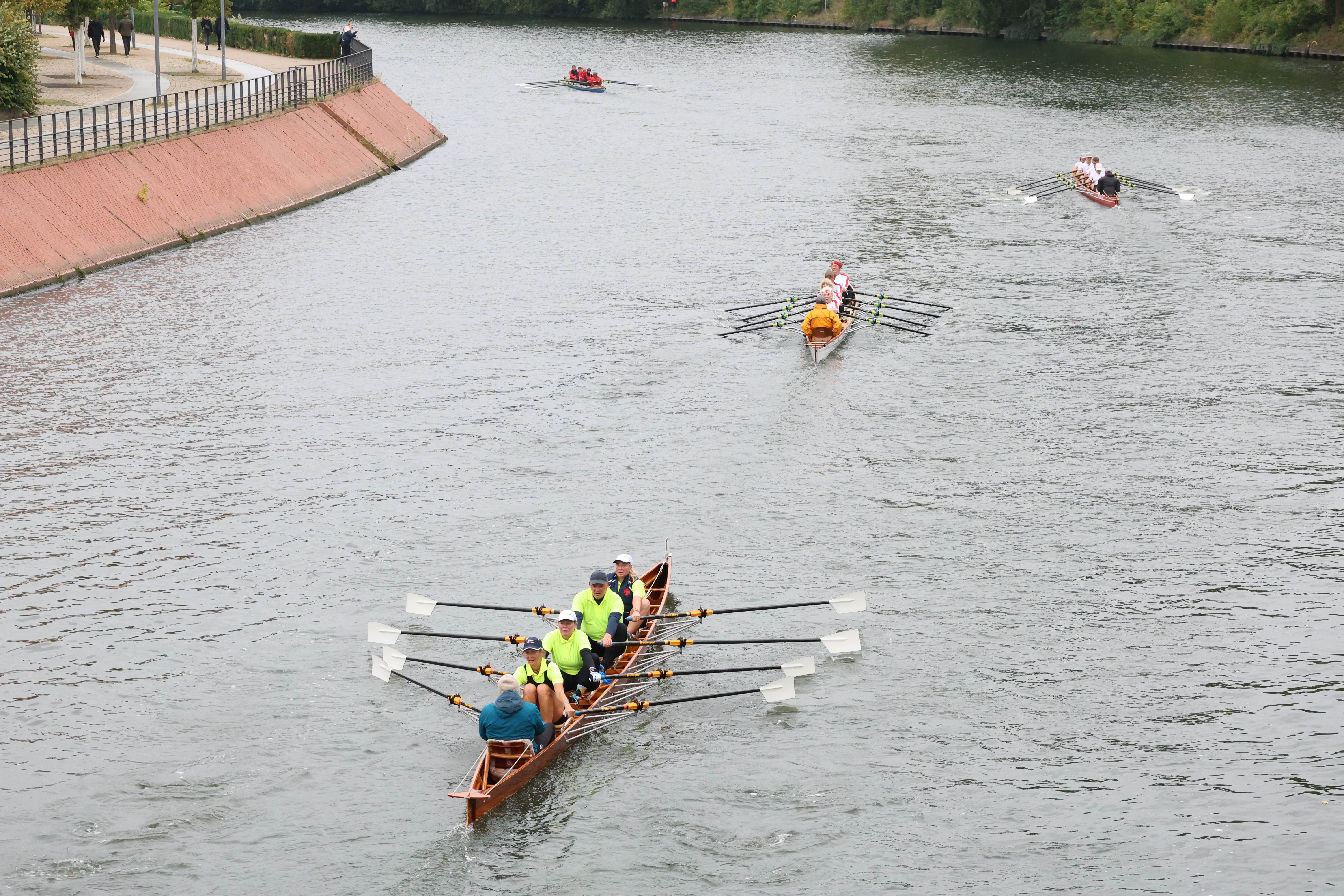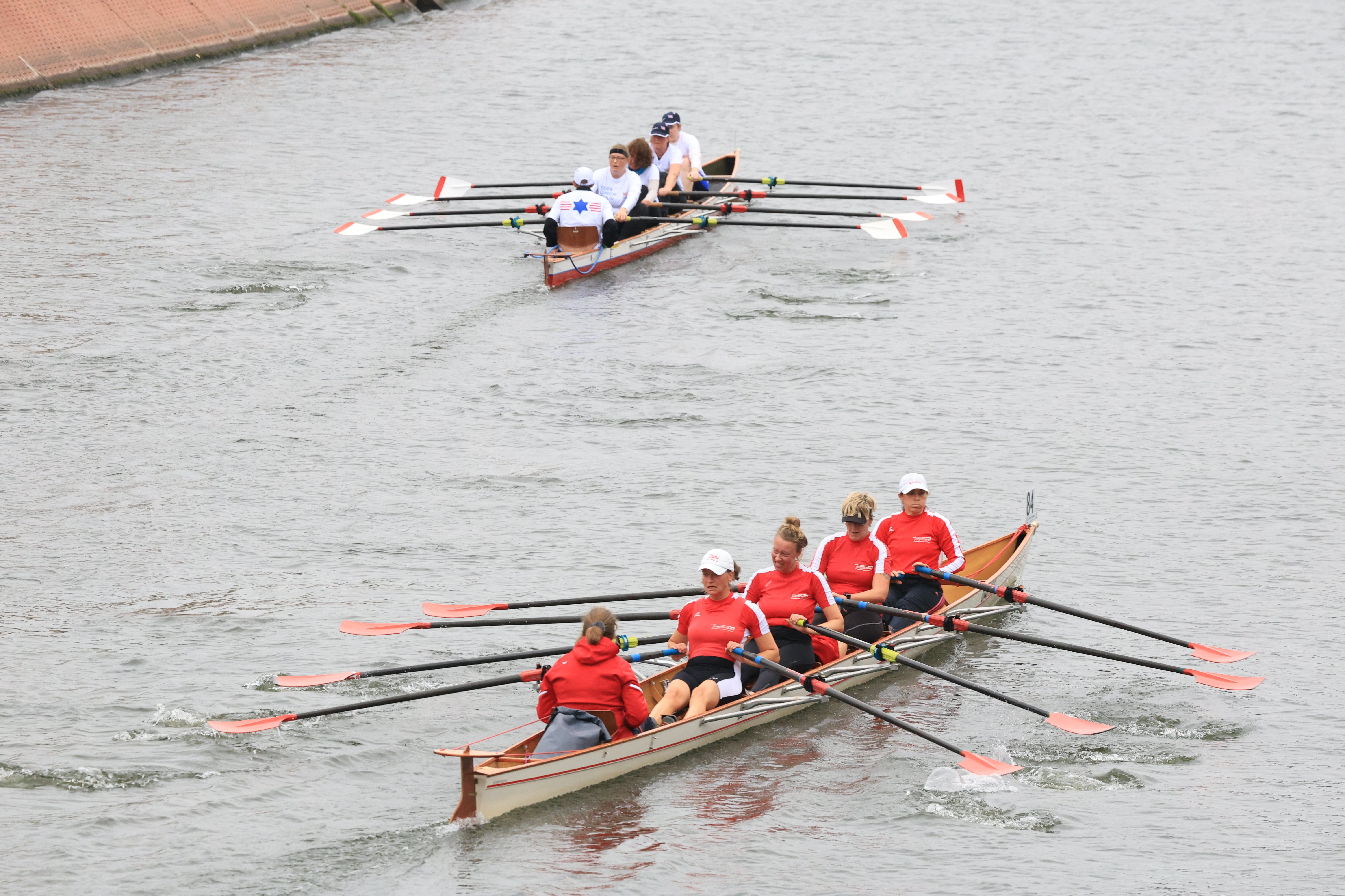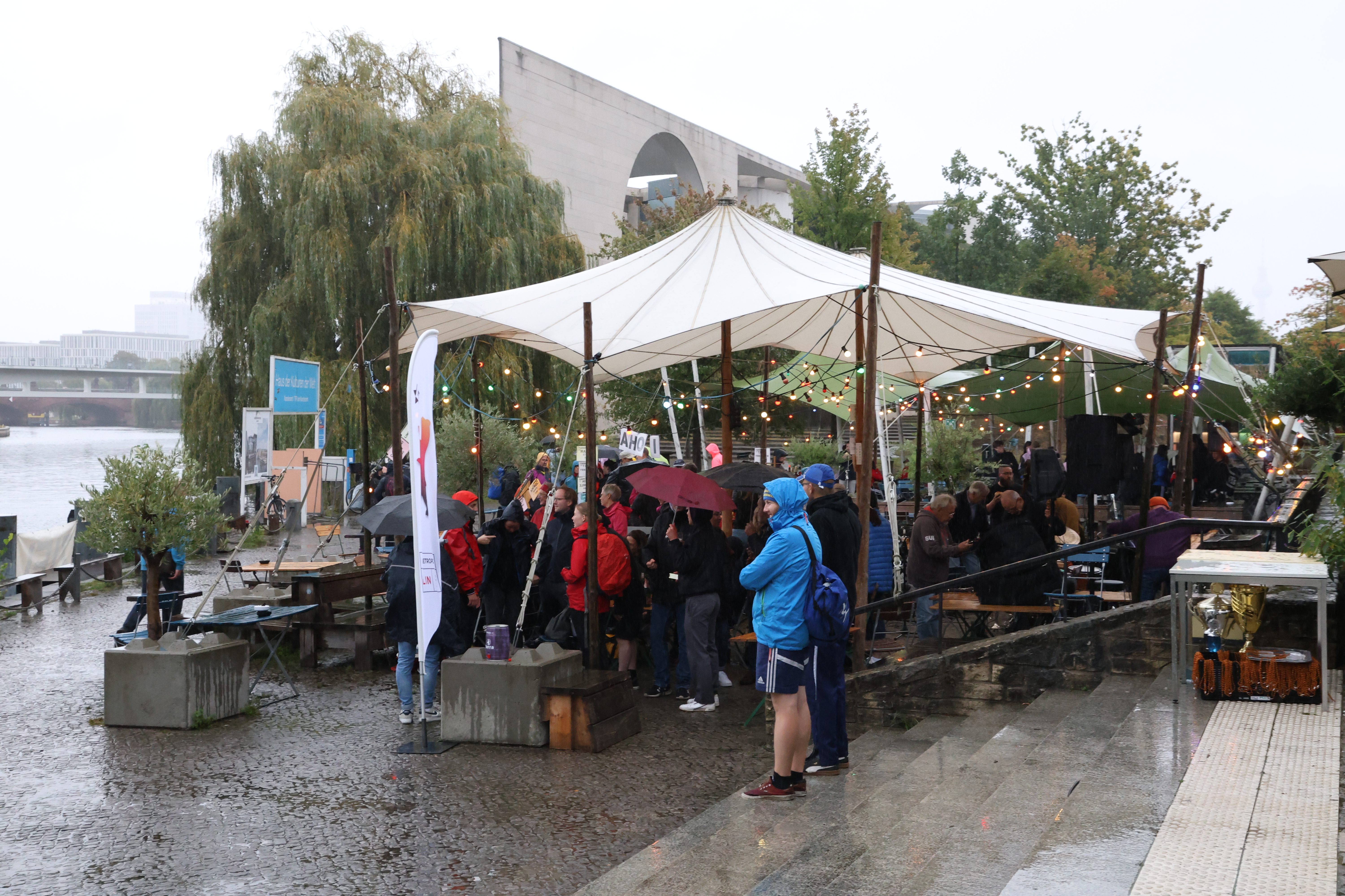Los ging's im Minutentakt ab 13 Uhr an der Mörschbrücke. Die Route führte vorbei an berühmten Sehenswürdigkeiten. Schloss Charlottenburg, Siegessäule und Bundeskanzleramt als Kulisse für die schönste Stadtrundfahrt Berlins. Rudern auf der Innenstadtspree – das ist normalerweise verboten und lädt zum Genießen ein. Doch der Wettkampfgedanke spornt an. Je nach Altersklasse ging's über 3.000 bzw. 7.000 Meter bis zum Ziel vorm Haus der Kulturen der Welt. Dort signalisierte LRV-Präsidiumsmitglied für Pararudern, Matthias Wodtke, mit der Glocke in der Hand jeden Zieleinlauf. Die Sir Gusche Jazzband sorgte – wie jedes Jahr – für Partylaune und hatte für die ankommenden Boote immer einen Tusch parat.