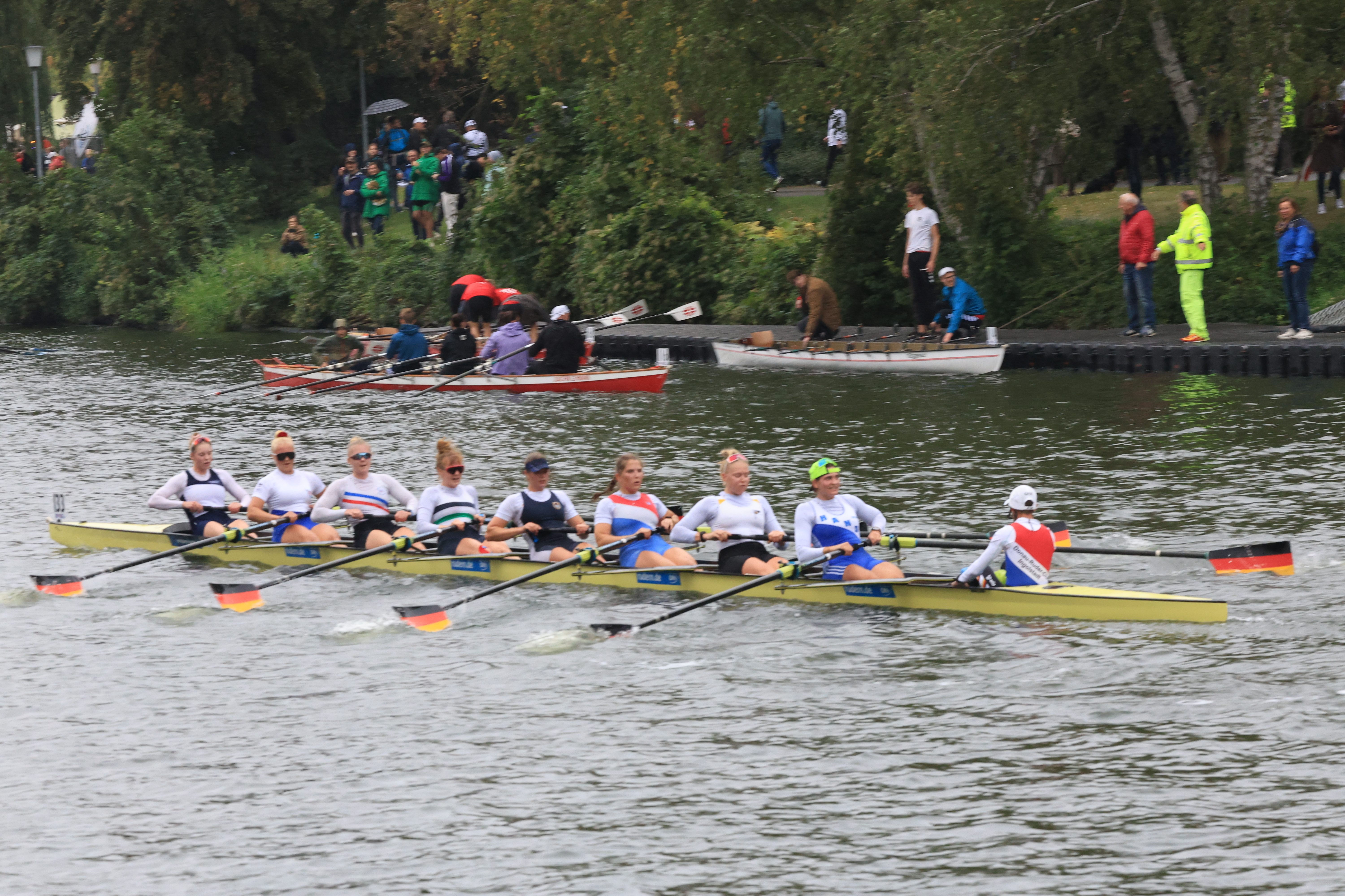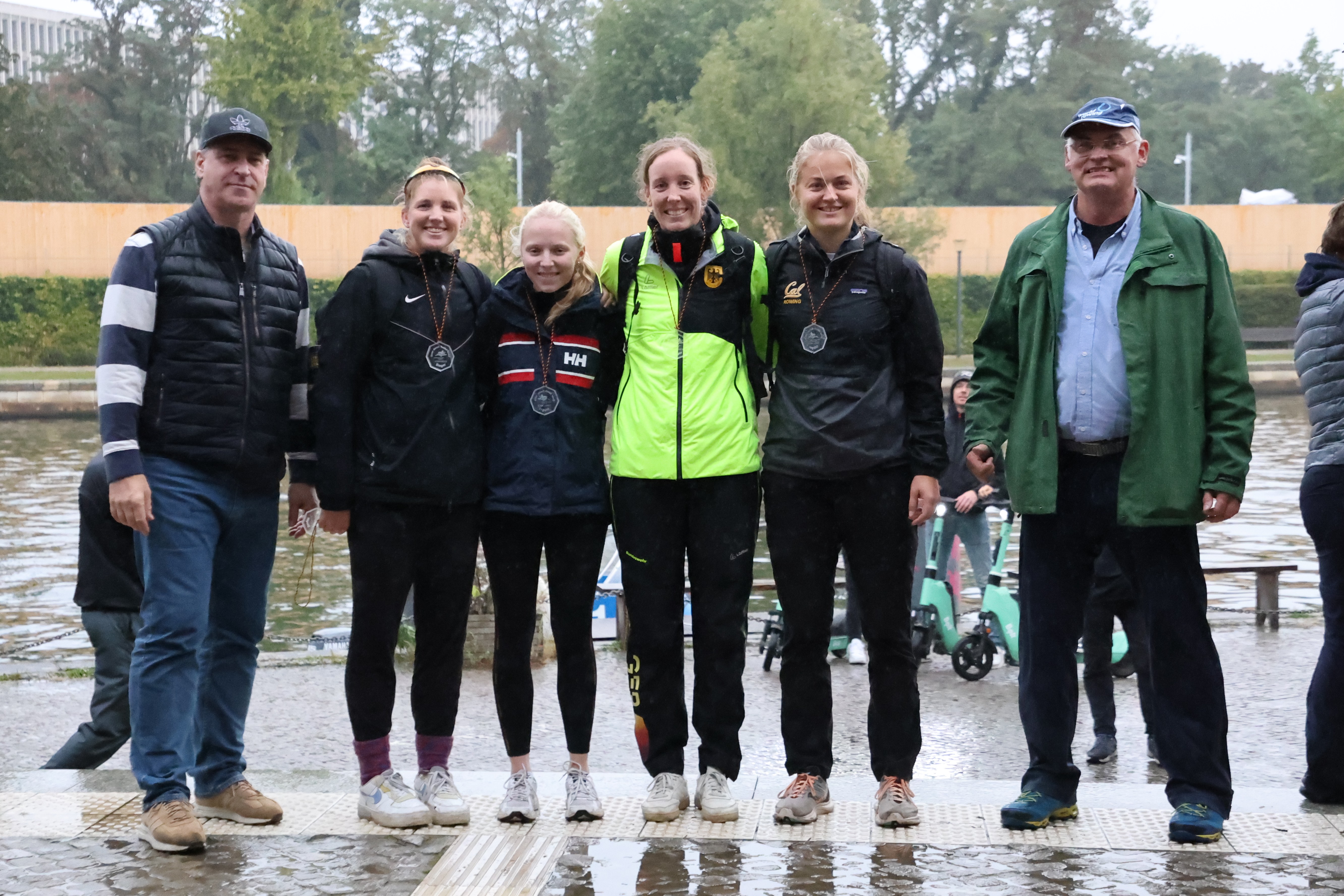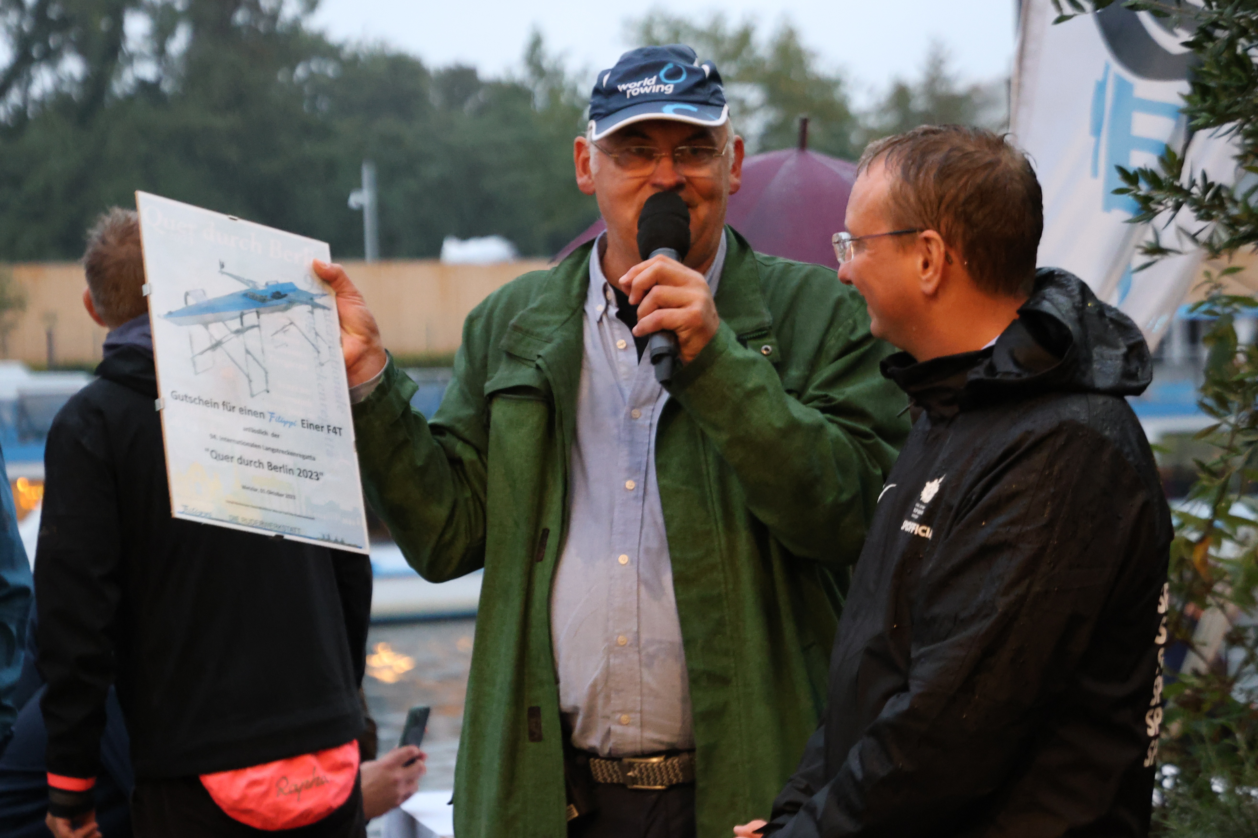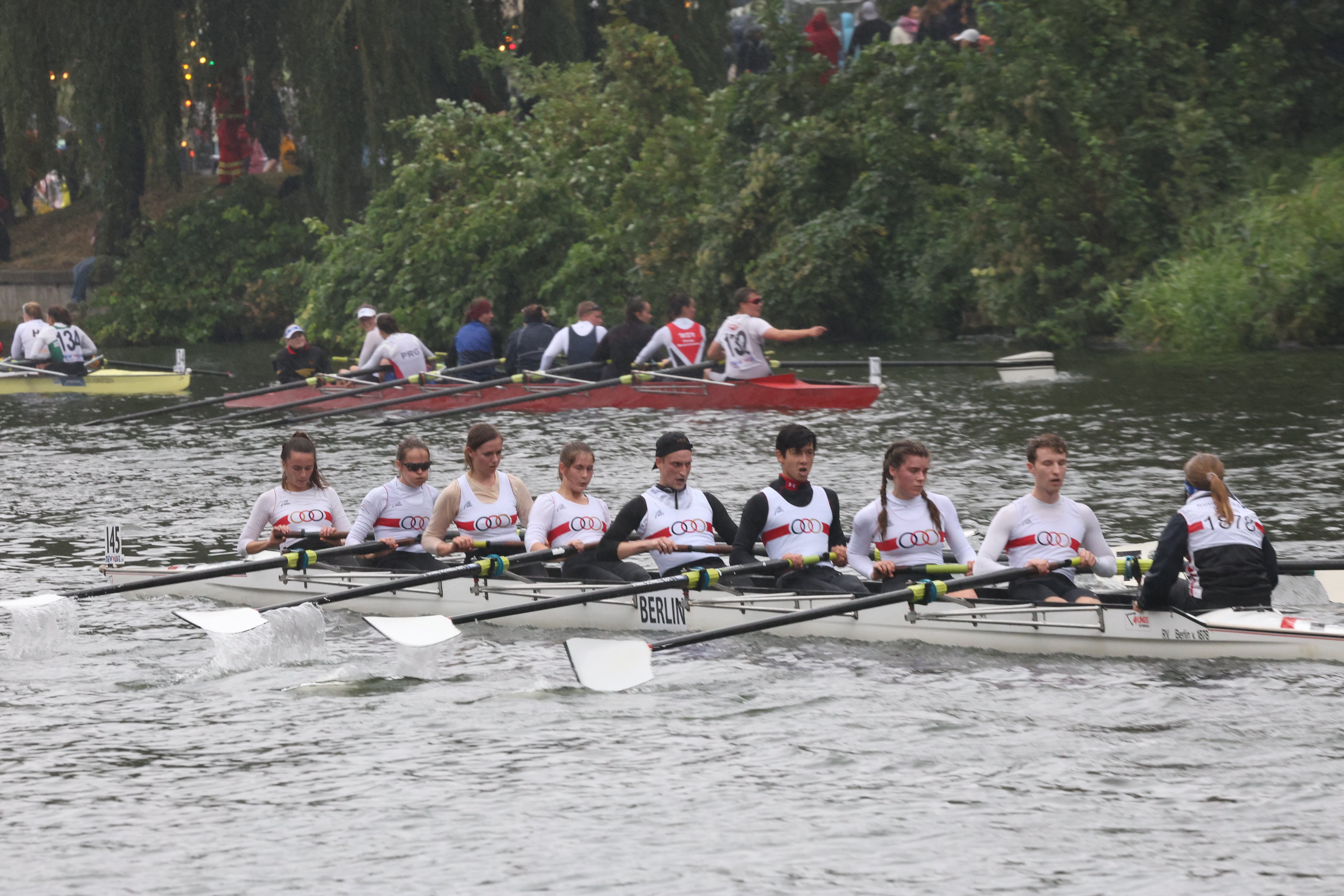 Nicht nur alle Altersklassen waren vertreten – auch alle Leistungsklassen. Sogar das Frauennationalteam mit Trainer Marcin Witkowski. Die Ruderinnen waren erst eine Woche zuvor wieder im Berliner Bundesstützpunkt am Hohenzollernkanal zusammengekommen und hatten ihr Training für die neue Saison begonnen. Der Termin von „Quer durch" passte zeitlich. Da wollten sie sich die Regatta nicht entgehen lassen. Sie starteten im Doppel-Vierer mit Steuerfrau und im Achter. Magdalena Hallay, Marlene Wegener, Annabella Bachmann, Melanie Göldner, Juliane Faralisch gewannen ihr Rennen in 25:27.65 Minuten. Der Frauen-Achter mit Nora Peuser, Frauke Hundeling, Luisa Schade, Judith Guhse, Sarah Wibberenz, Pia Greiten, Tabea Schendekehl, Leonie Menzel und Steuermann Florian Koch holte sich den Pokal mit einer Zeit von 23:45.89 Minuten. Moderator Thorsten Kohlisch wünschte denTop-Athletinnen viel Erfolg beim Wintertraining und viel Glück für Paris.