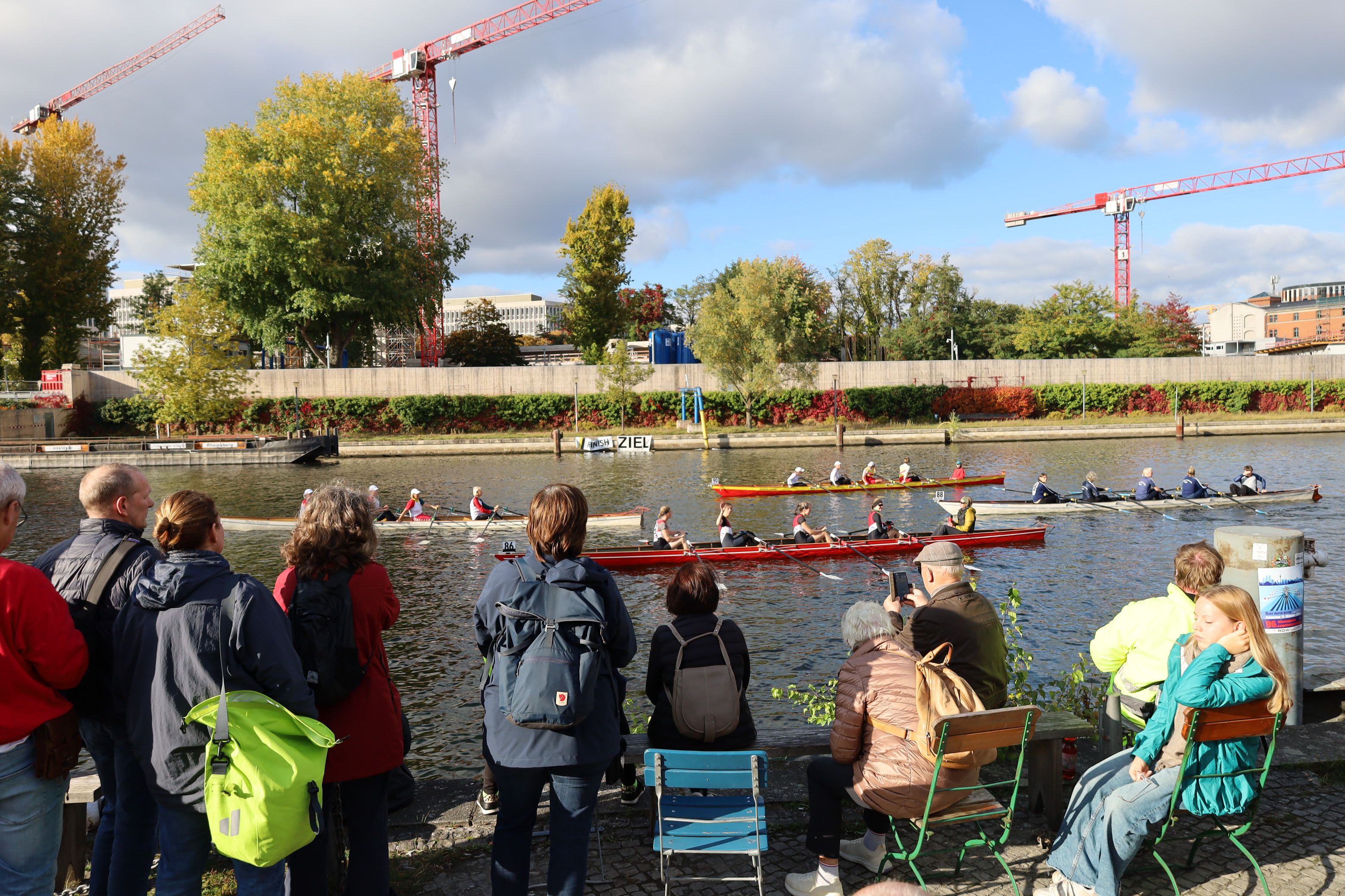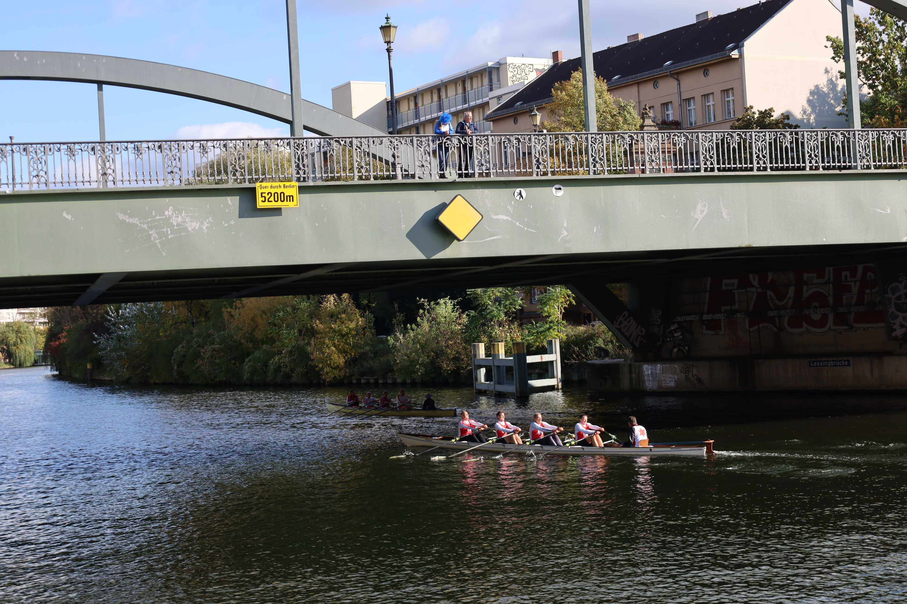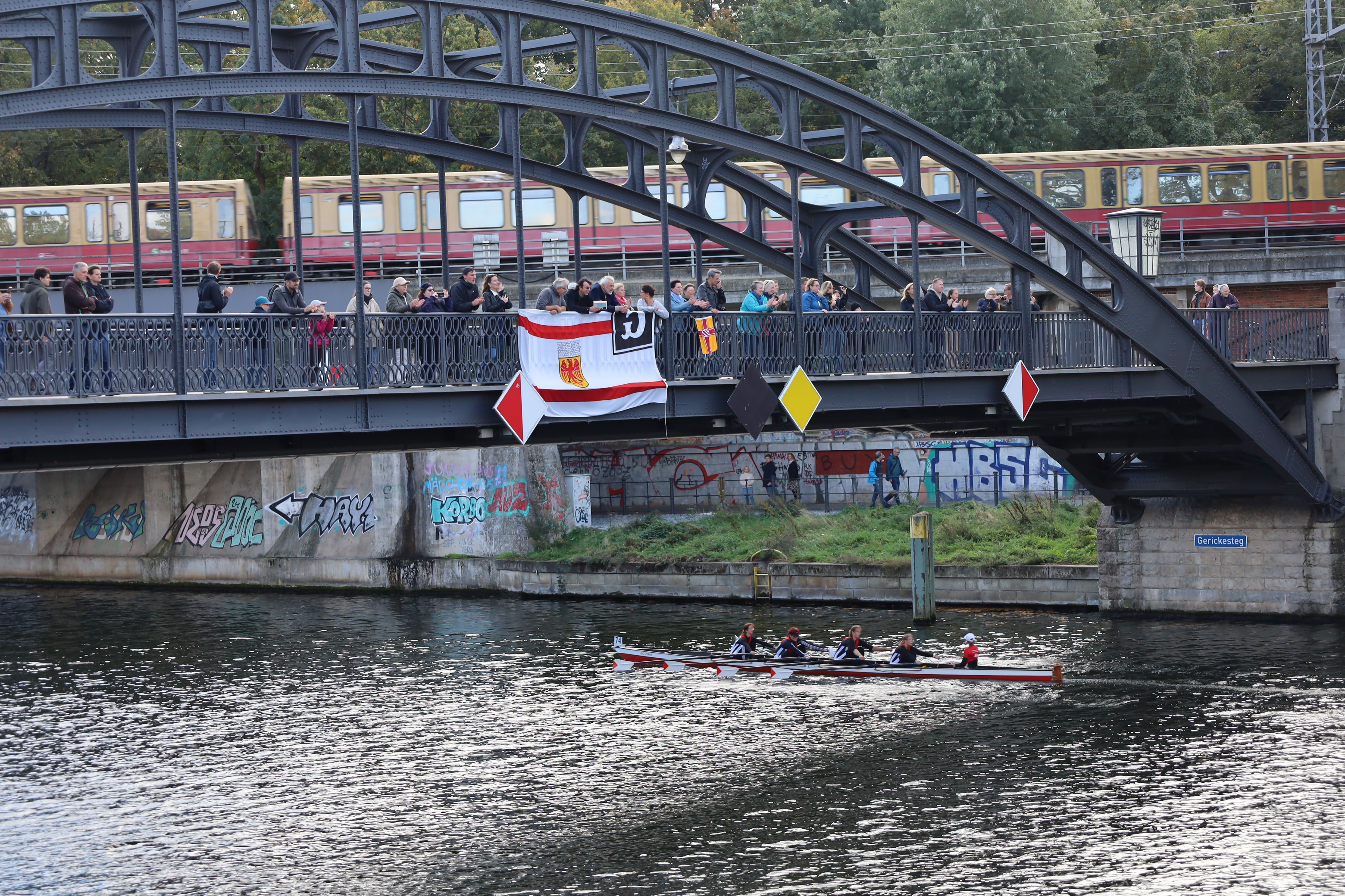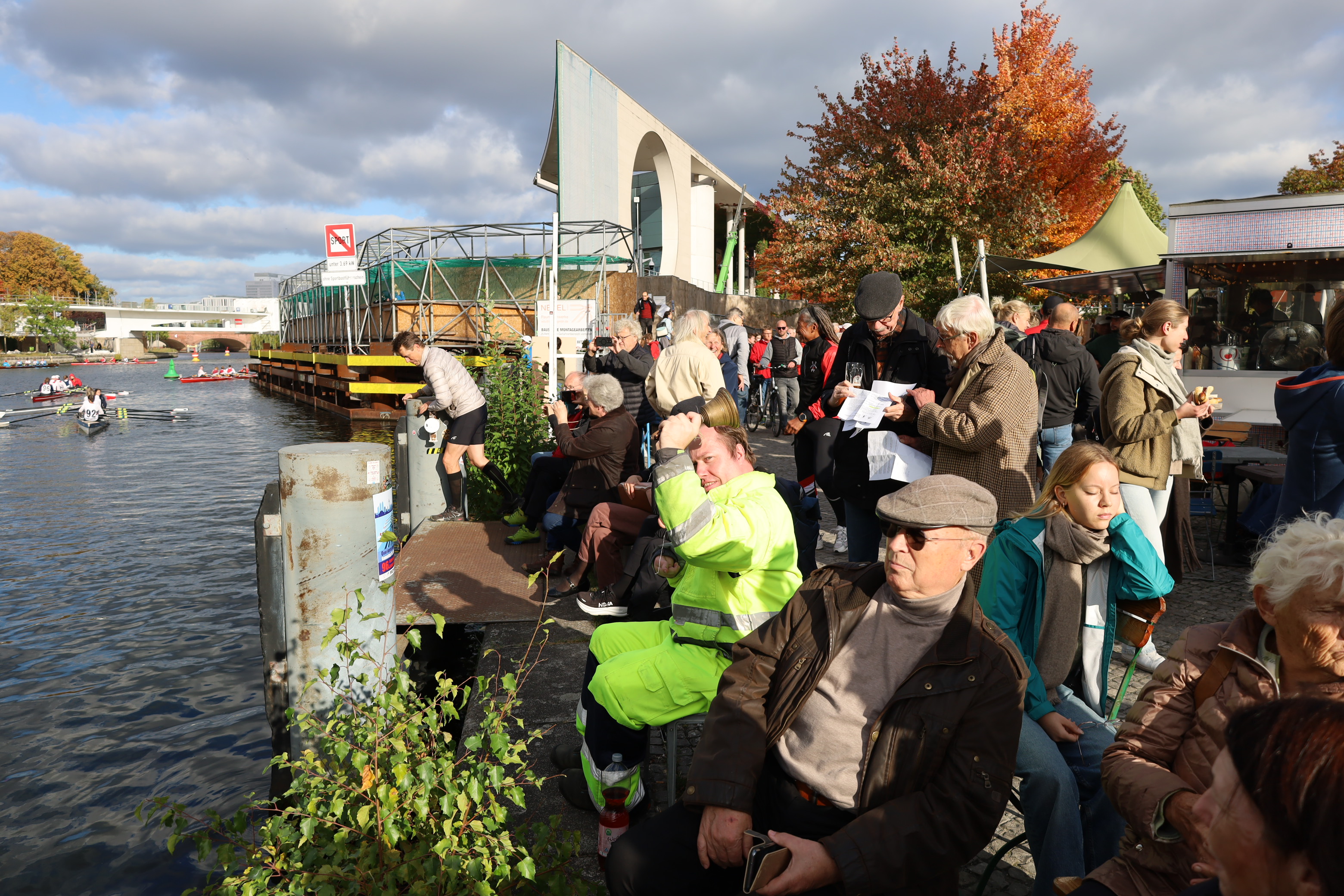 Ruderboote auf der Innenstadt-Spree – ein ungewöhnlicher Anblick. Spaziergänger, Touristen, Radfahrer staunten. Rudern ist dort normalerweise verboten. Eine Ausnahme einmal im Jahr ist die Internationale Langstreckenregatta „Quer durch Berlin“ – eine der traditionsreichsten Sportveranstaltungen in der Hauptstadt. Am 11. Oktober 2025 fiel der Startschuss zum 96. Mal. Ausflugsdampfer und Motorboote blieben liegen, als die Regatta um 13 Uhr an der Mörschbrücke begann. In Minuten-Abständen machten sich die Vierer und Achter auf den Weg – über 7.000 Meter vorbei am Park Charlottenburg, an der Siegessäule bis zum Haus der Kulturen der Welt neben dem Bundeskanzleramt. Dort läutete LRV-Präsidiumsmitglied Matthias Grüneberg die Zielglocke. Und die Sir Gusche Band steigerte wieder traditionell die gute Stimmung.