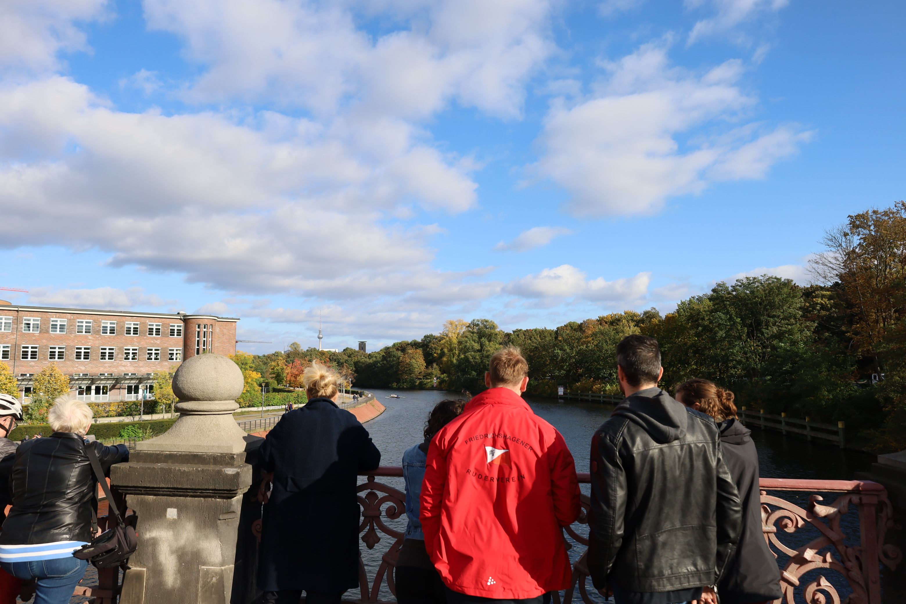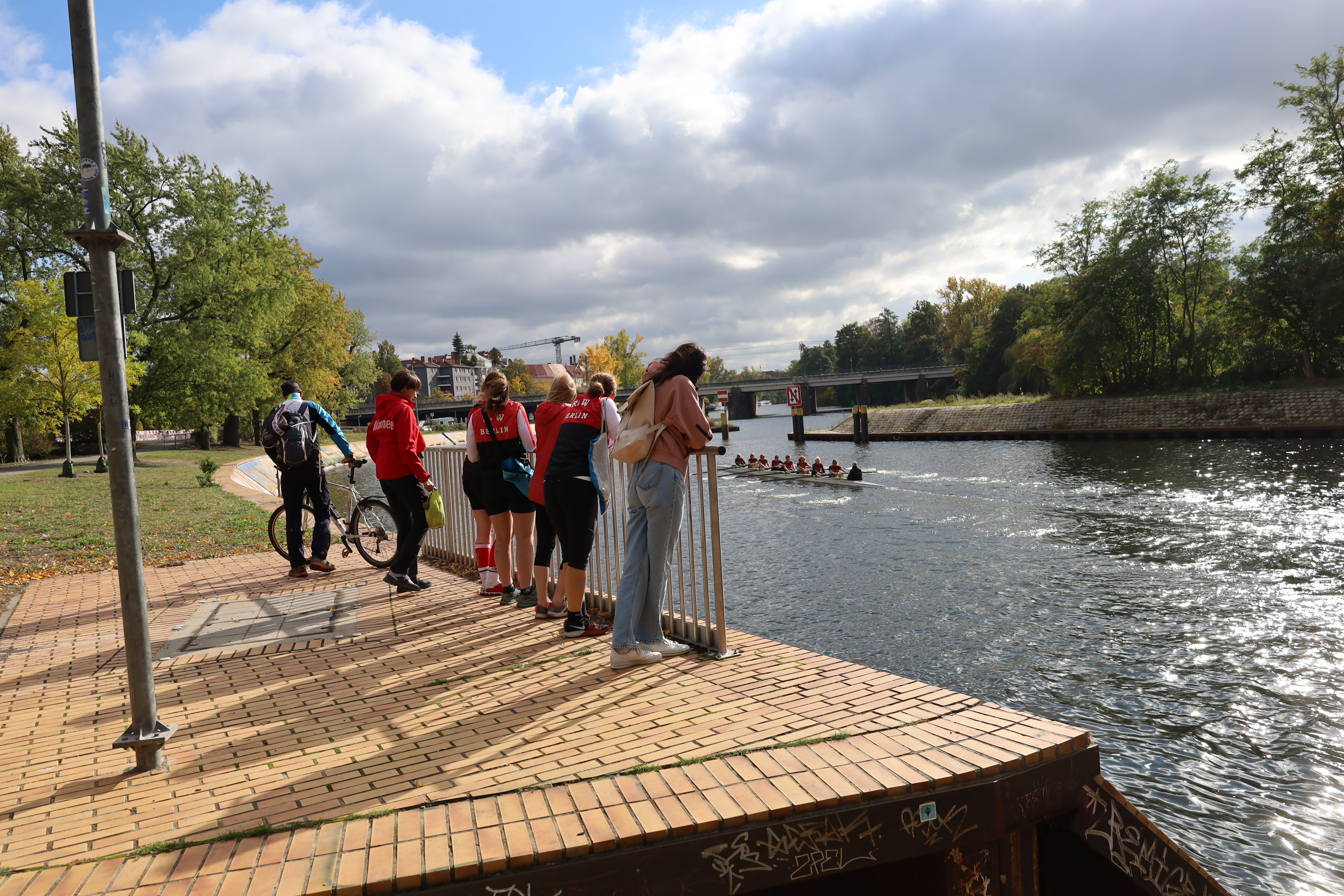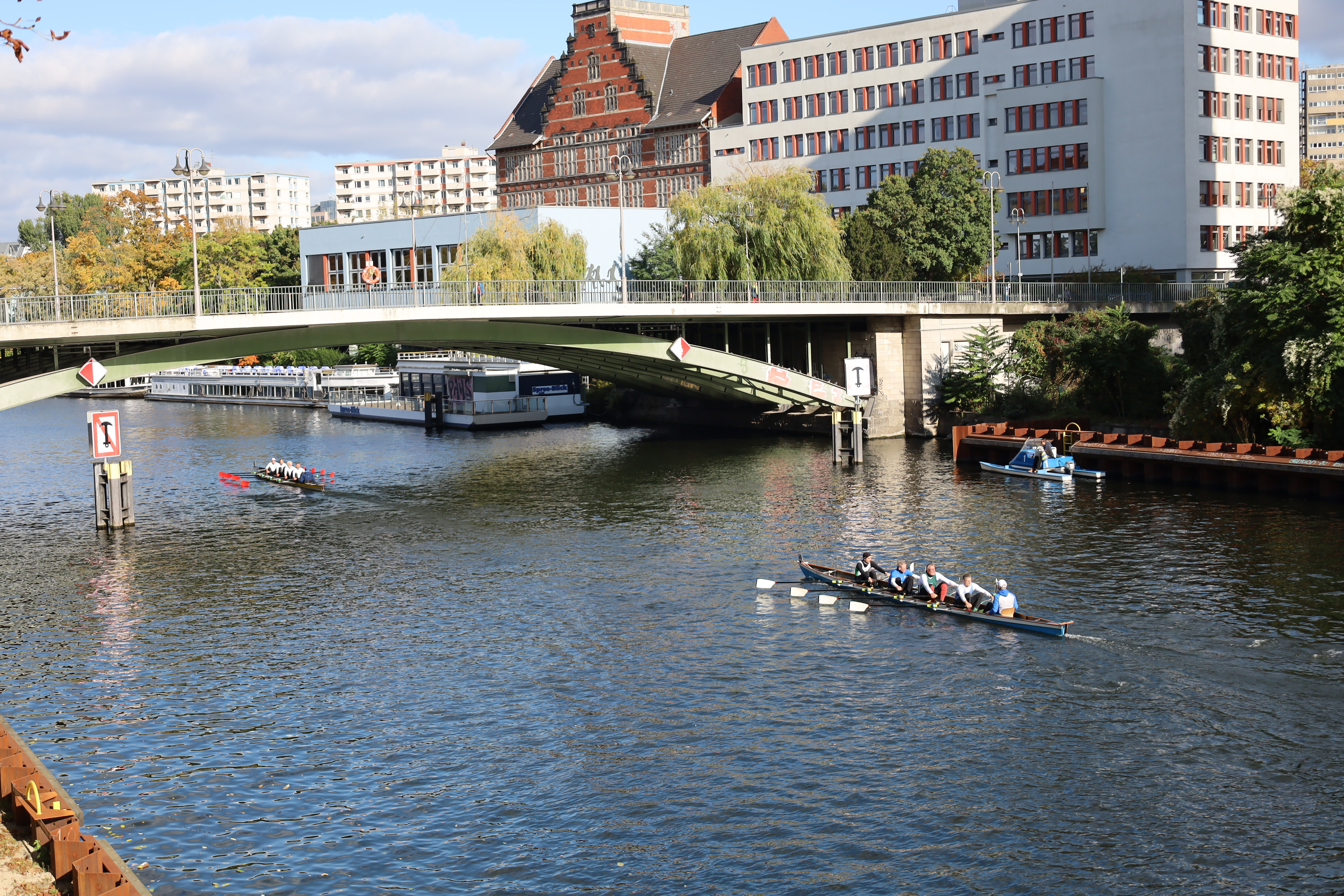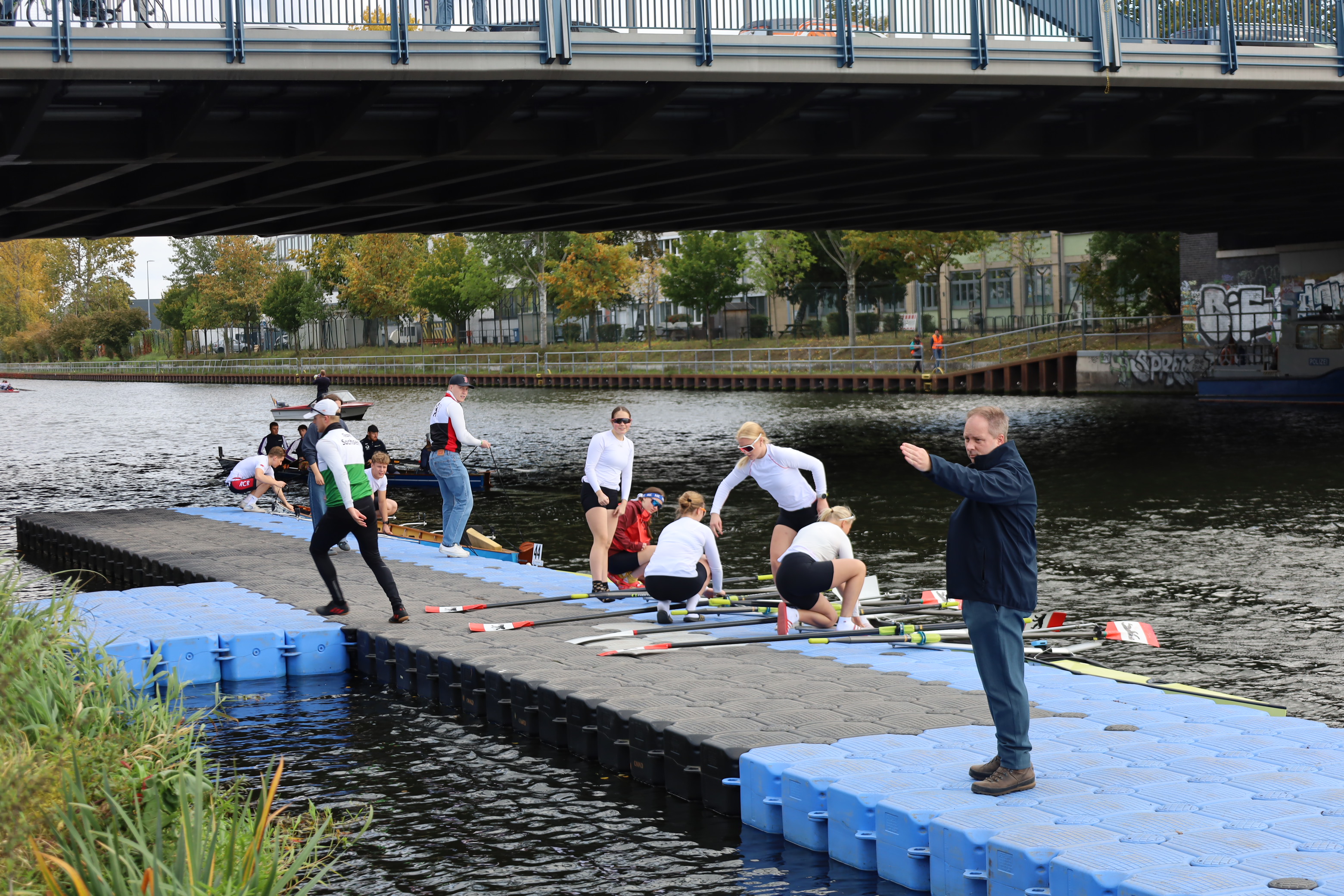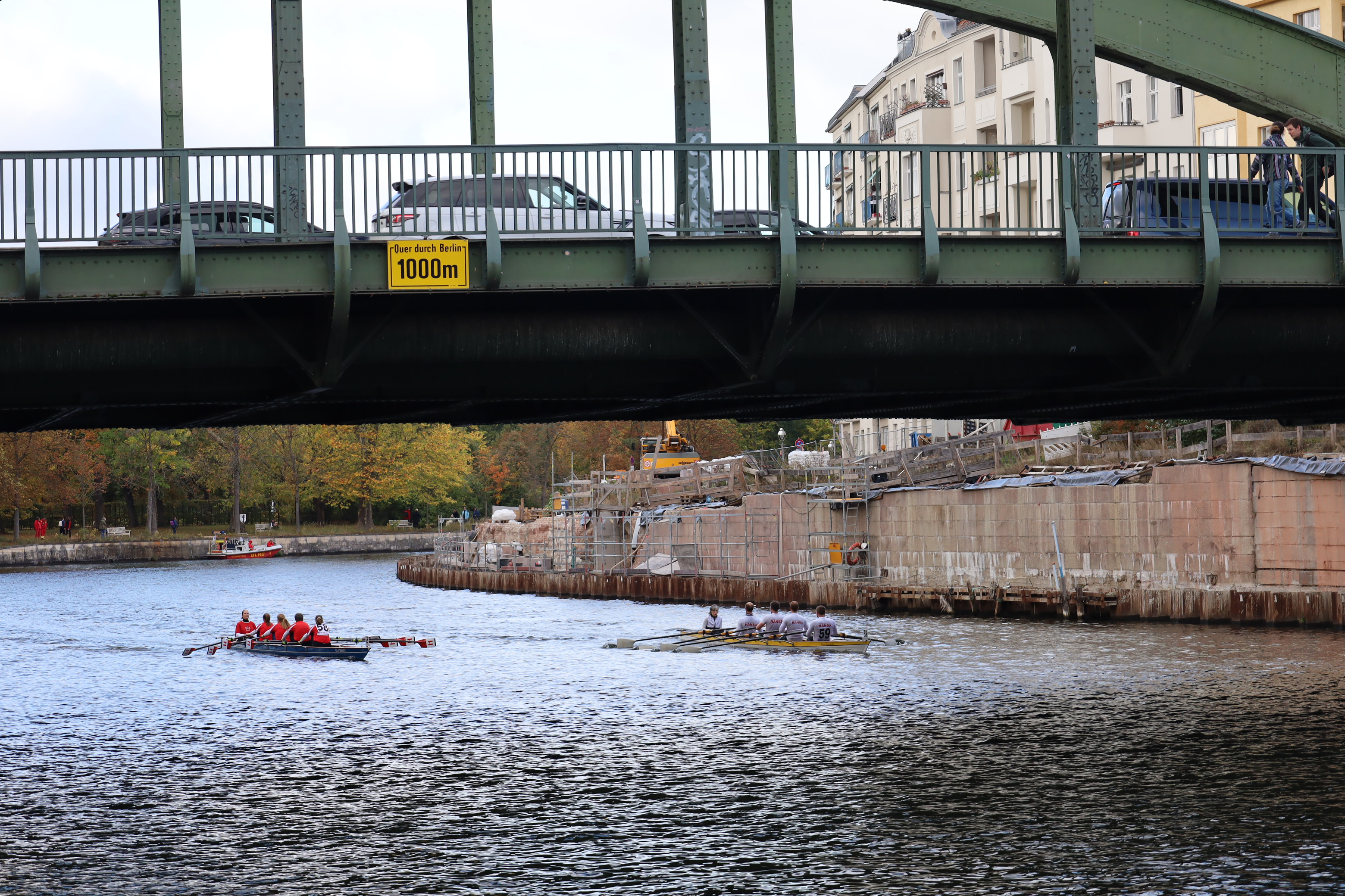 Ruderboote auf der Innenstadt-Spree – ein ungewöhnlicher Anblick. Spaziergänger, Touristen, Radfahrer staunten. Rudern ist dort normalerweise verboten. Eine Ausnahme einmal im Jahr ist die Internationale Langstreckenregatta „Quer durch Berlin“ – eine der traditionsreichsten Sportveranstaltungen in der Hauptstadt. Am 11. Oktober 2025 fiel der Startschuss zum 96. Mal. Ausflugsdampfer und Motorboote blieben liegen, als die Regatta um 13 Uhr an der Mörschbrücke begann. In Minuten-Abständen machten sich die Vierer und Achter auf den Weg – über 7.000 Meter vorbei am Park Charlottenburg, an der Siegessäule bis zum Haus der Kulturen der Welt neben dem Bundeskanzleramt. Dort läutete LRV-Präsidiumsmitglied Matthias Grüneberg die Zielglocke. Und die Sir Gusche Band steigerte wieder traditionell die gute Stimmung.