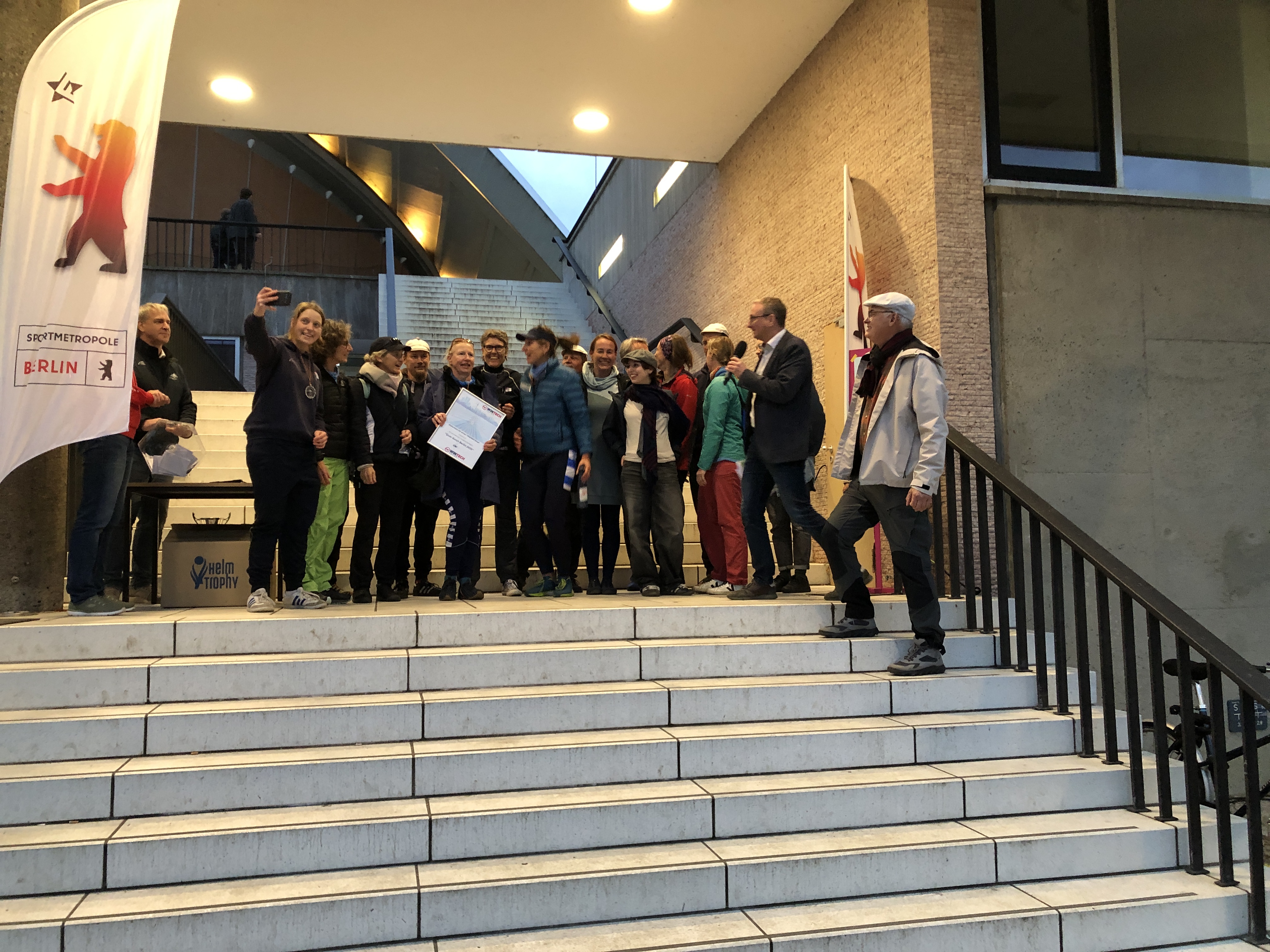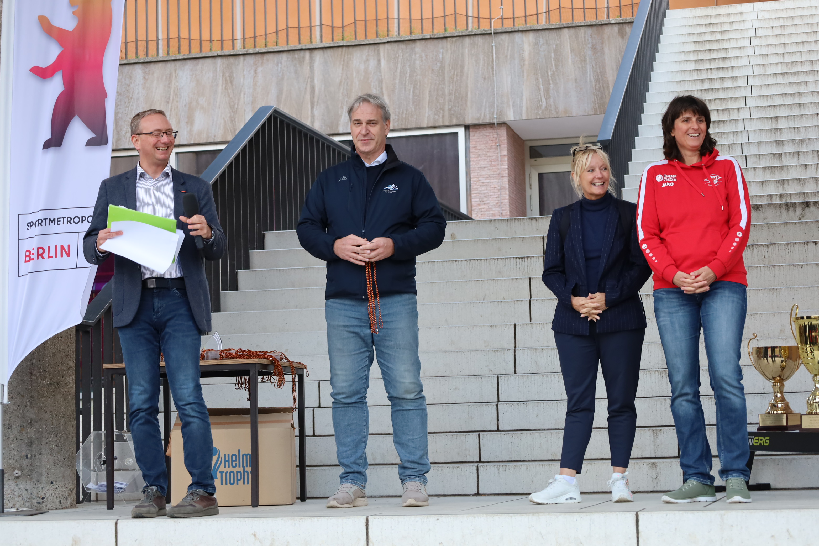 Mit dabei waren 140 Boote mit rund 840 Aktiven aller Altersklassen. Sie kamen aus ganz Deutschland, den Niederlanden, Dänemark und Großbritannien. „Berlin ist immer eine Reise wert", erklärten die Gäste vom Tribesmen Rowing Club, die zu Hause im irischen Galway auf dem Corrib River trainieren. Sie waren das erste Mal in Berlin dabei und haben auf Anhieb ihr Rennen gewonnen. Mit Medaillen um den Hals versprachen sie, im nächsten Jahre auf jeden Fall wiederzukommen und noch mehr Teams mitzubringen. Sie nahmen vorweg, was Moderator Thomas Kohlisch launig als ungeschriebene Regattaregel bezeichnete: Wer gewinnt, muss nächstes Mal wieder mitmachen. Er moderierte die Siegerehrung gemeinsam mit LRV-Präsident Thomas Haun, LRV-Ehrenmitglied Michael Hehlke sowie den Ehrengästen Dunja Wolff, stellv. Vorsitzende des Sportausschusses im Abgeordnetenhaus von Berlin, und Ulrike Hartmann, LRV-Präsidentin Brandenburg.